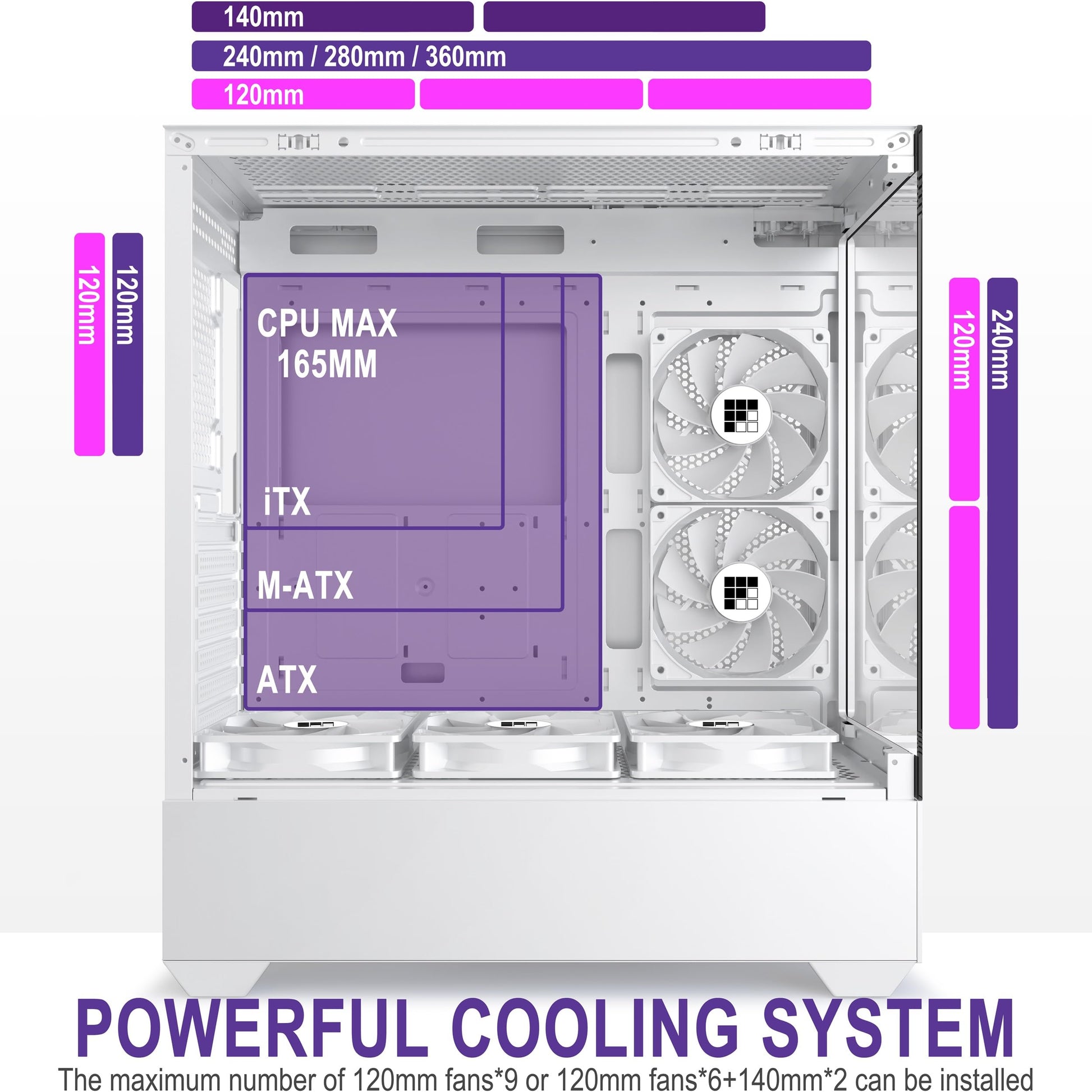 Das Doppelkammer-Design trennt die Hauptkomponenten vom Netzteil und den Laufwerken, was nicht nur für eine aufgeräumte Optik, sondern auch für eine verbesserte thermische Leistung sorgt. Die werkzeuglos abnehmbaren Glaspaneele ermöglichen einen schnellen und unkomplizierten Zugriff auf alle Komponenten, was den Zusammenbau und die Wartung erheblich vereinfacht. Mit Unterstützung für bis zu neun Lüfter und grosse Radiatoren müssen Sie trotz des eleganten Glas-Designs keine Kompromisse bei der Kühlleistung eingehen.