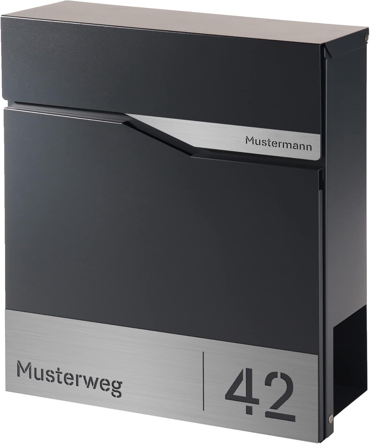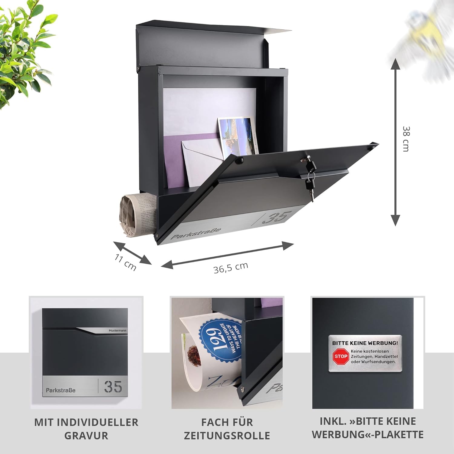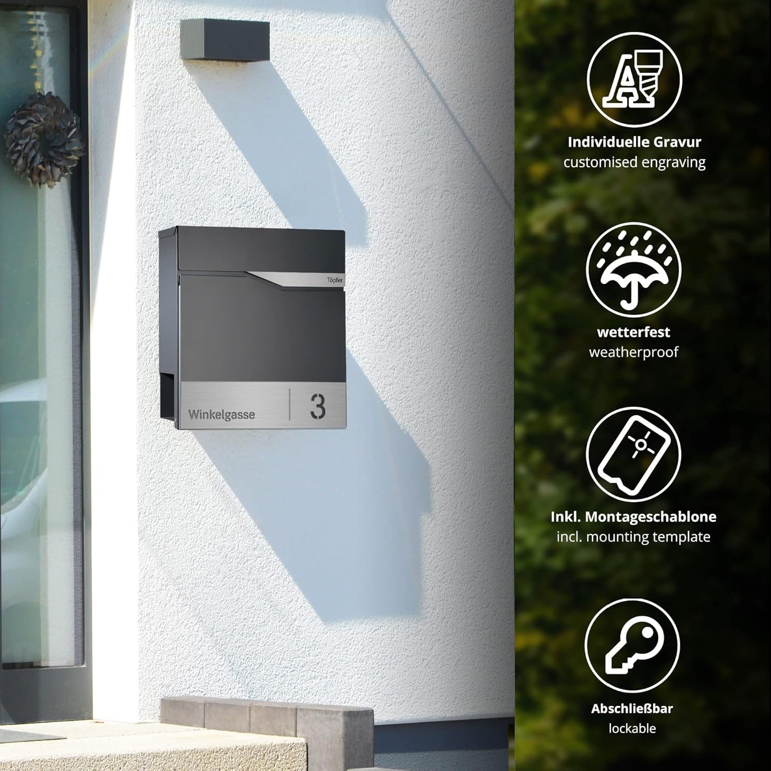 Verleihen Sie Ihrem Eingangsbereich eine persönliche und moderne Note. Dieser hochwertige Briefkasten in elegantem Anthrazit kombiniert ein stilvolles Design mit praktischer Funktionalität und Ihrer individuellen Gravur.