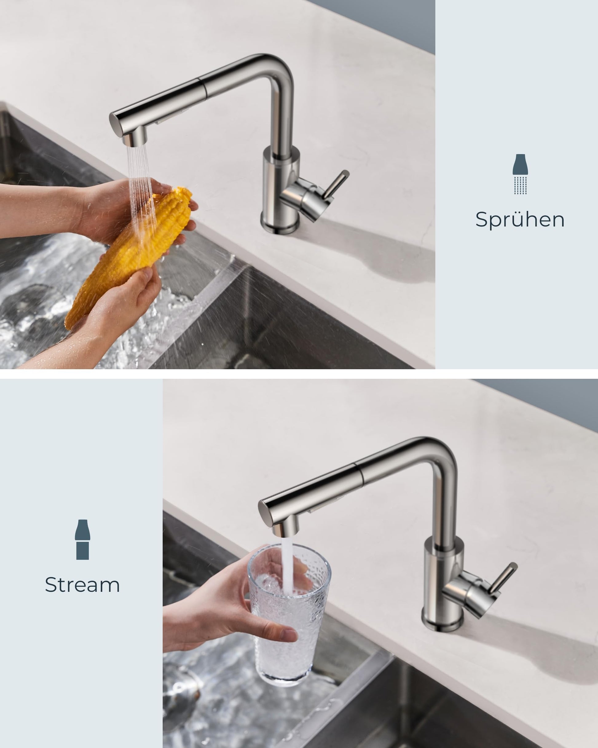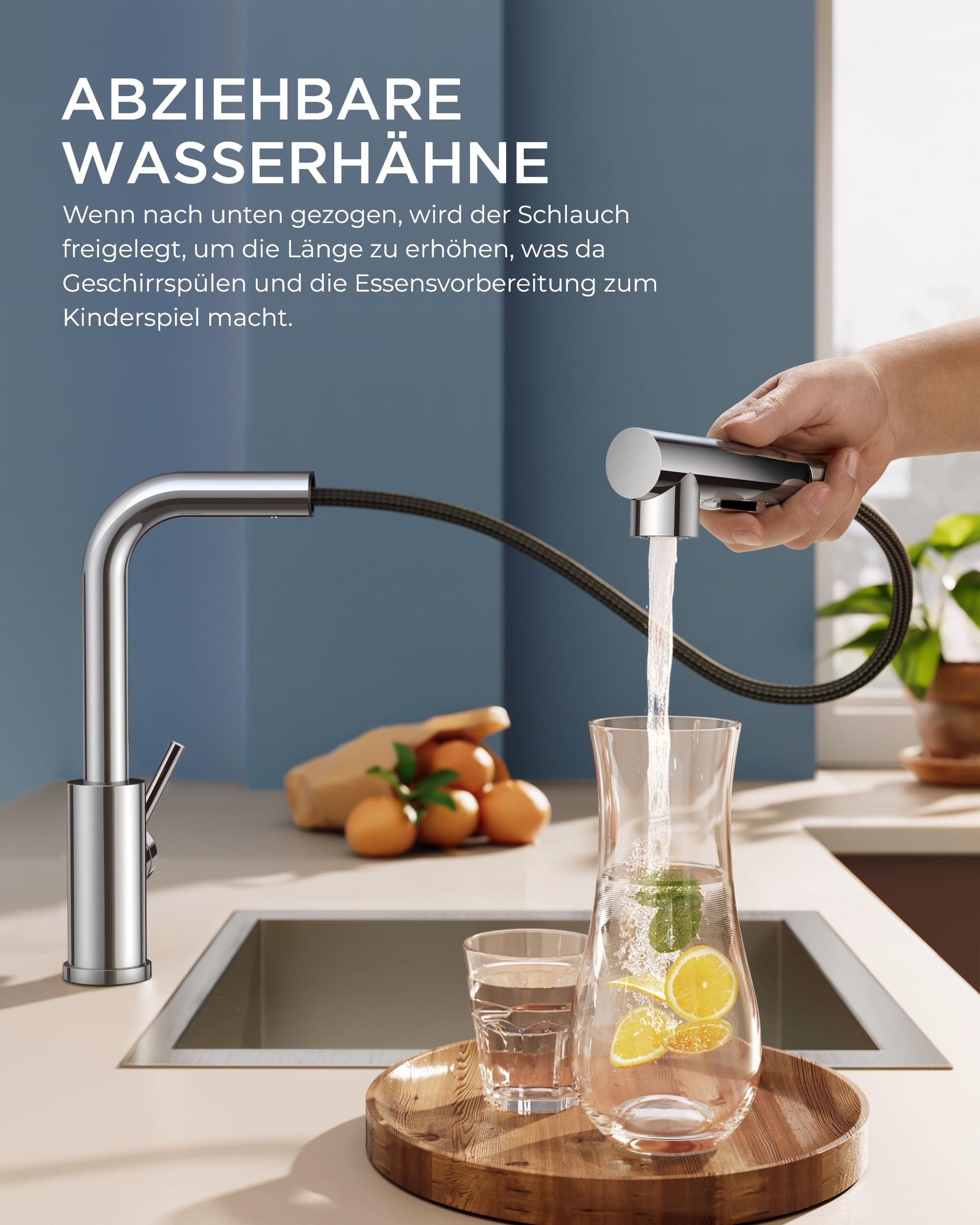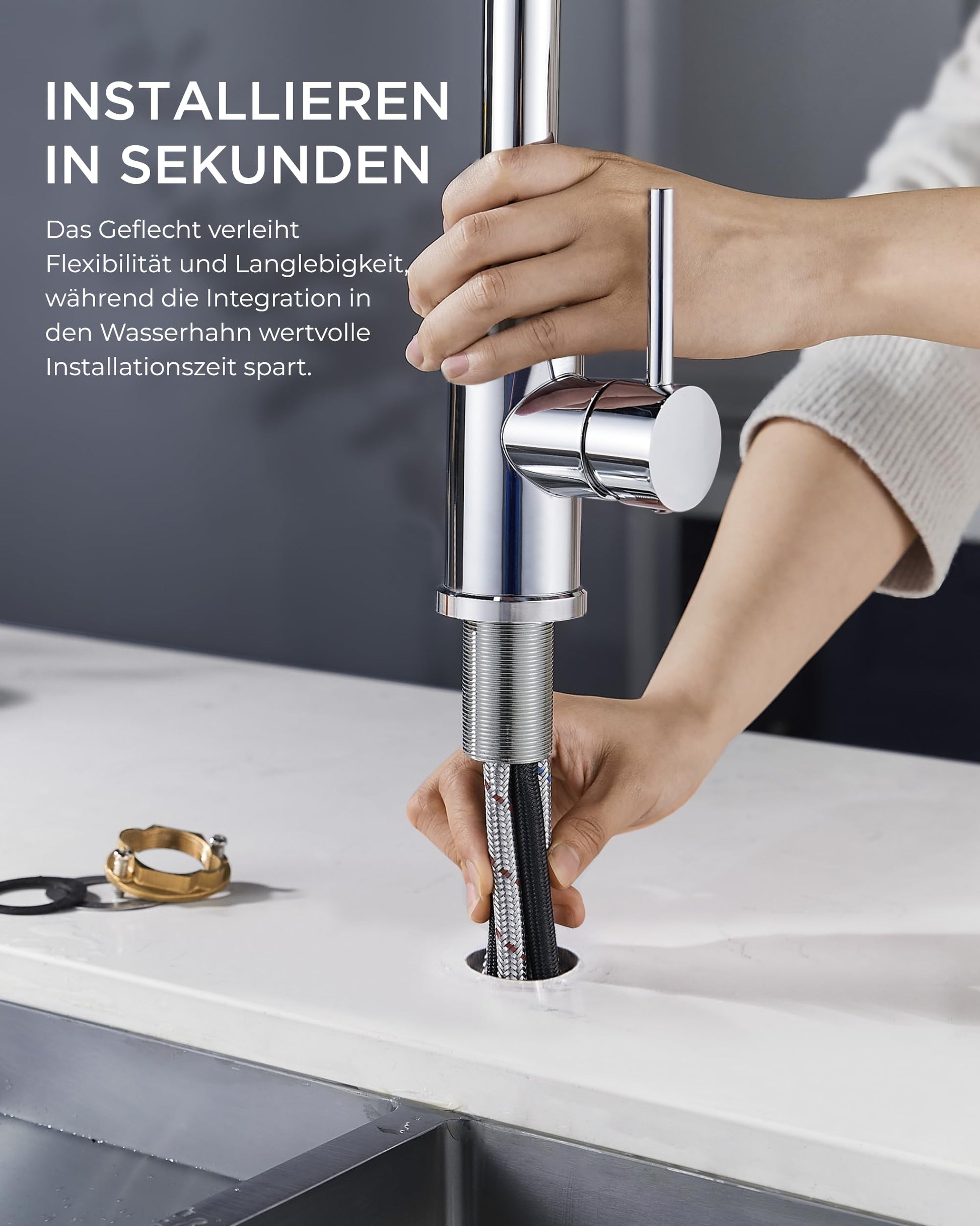 - Ausziehbare Handbrause: Der flexible, ausziehbare Schlauch erweitert Ihren Aktionsradius erheblich und ermöglicht es Ihnen, mühelos jede Ecke des Spülbeckens zu erreichen.