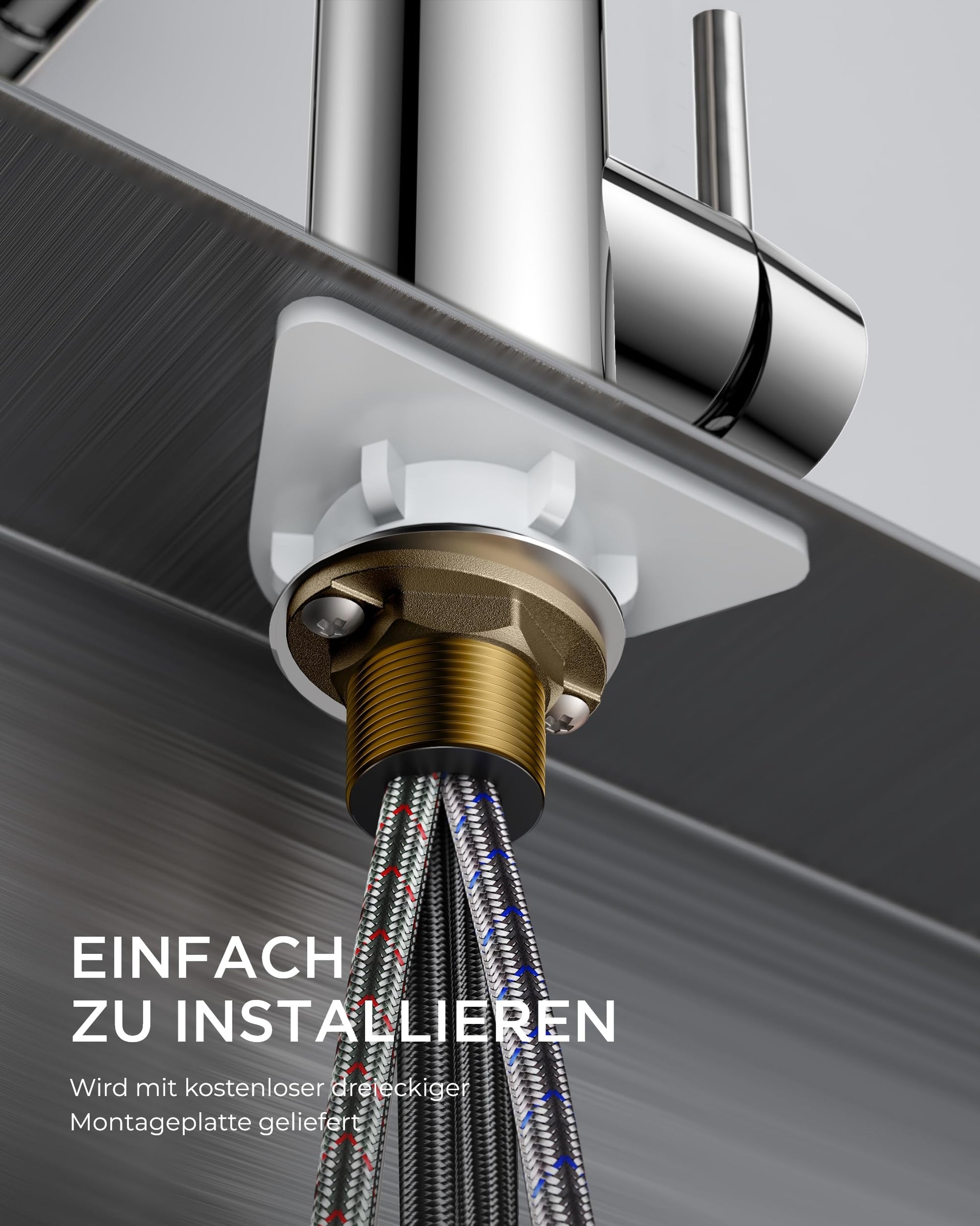 - 360° Schwenkbereich: Der Wasserhahn lässt sich vollständig um die eigene Achse drehen und bietet so maximale Flexibilität, ideal für Doppelspülbecken oder das Befüllen grosser Töpfe.