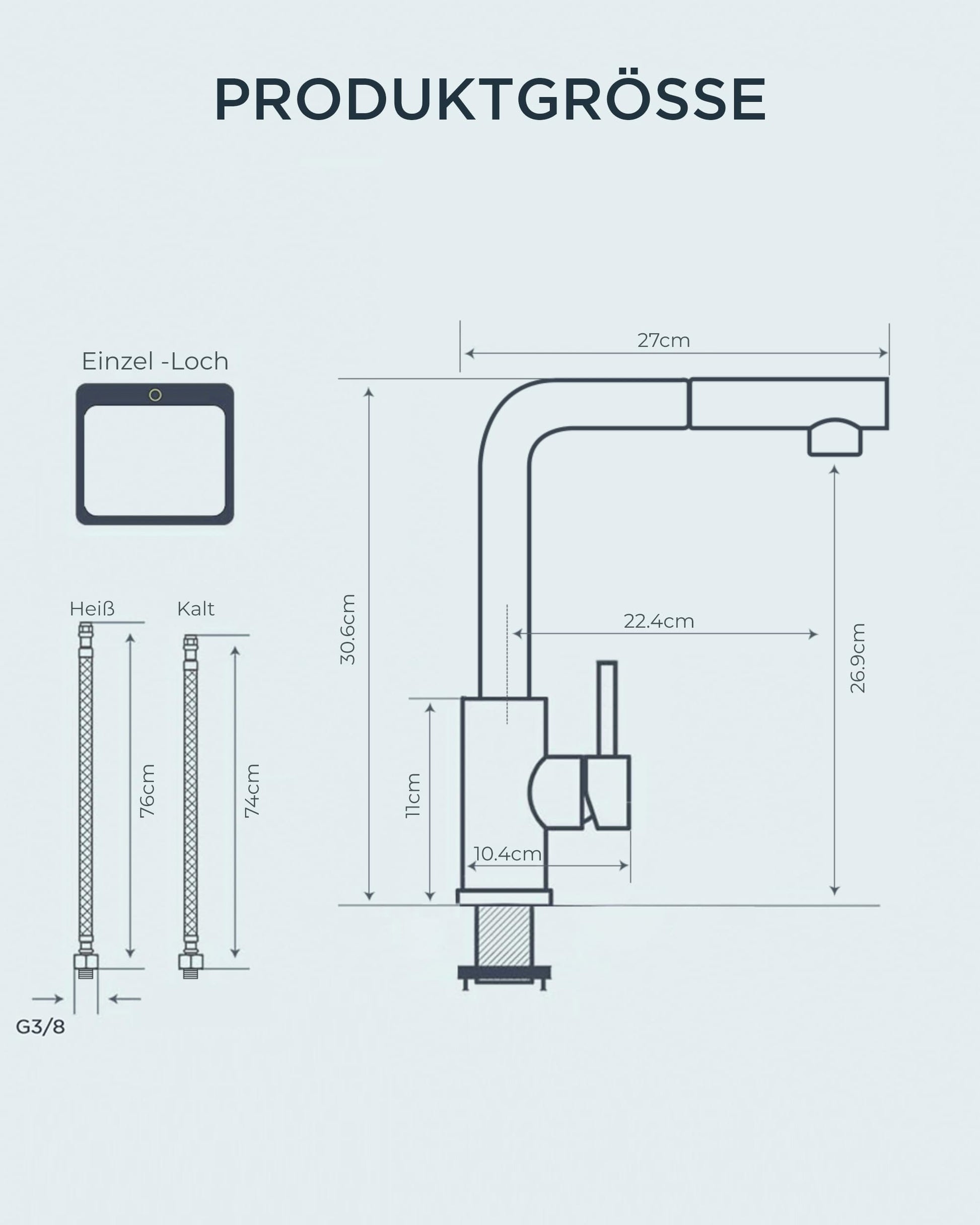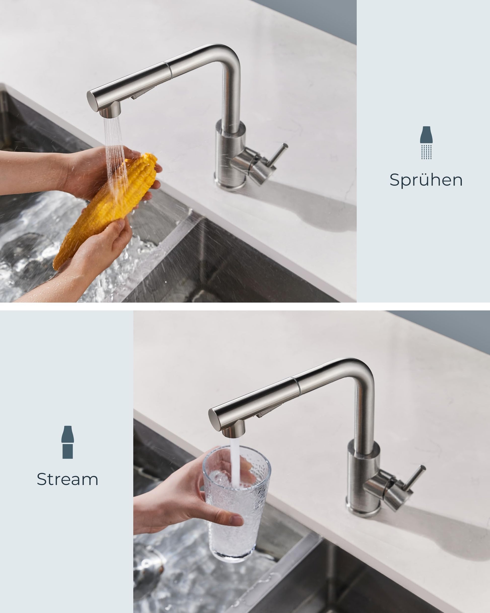 - Ausziehbare Handbrause: Der flexible Brauseschlauch lässt sich bequem herausziehen, um auch grosse Töpfe zu befüllen oder jede Ecke des Spülbeckens bequem zu erreichen. Nach Gebrauch zieht er sich sanft in seine Ausgangsposition zurück.