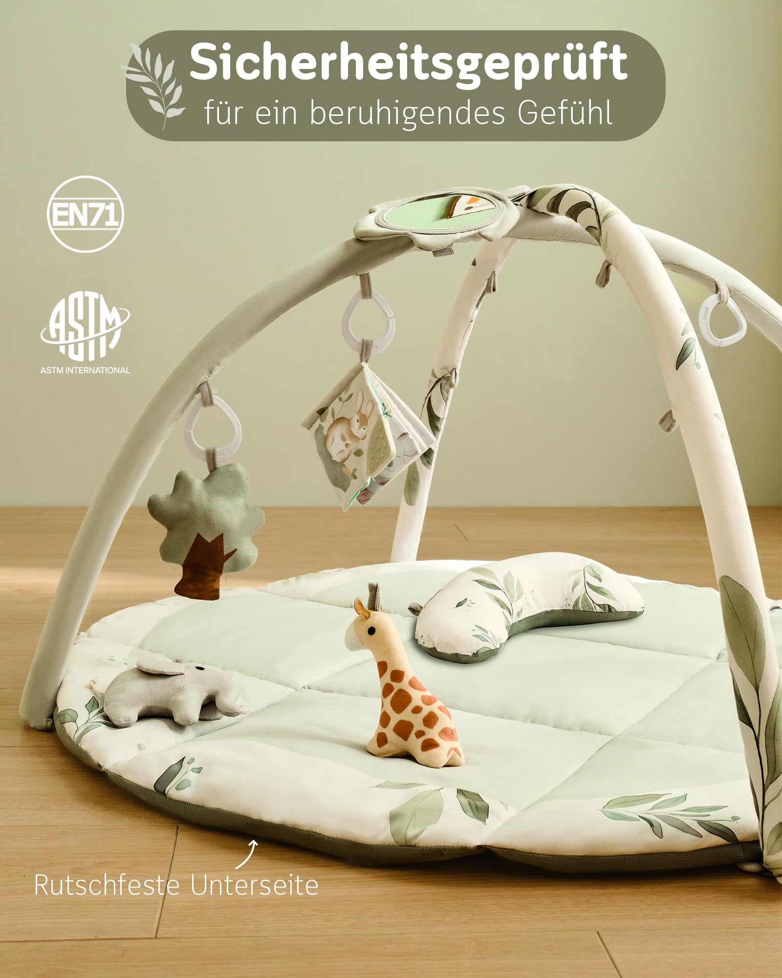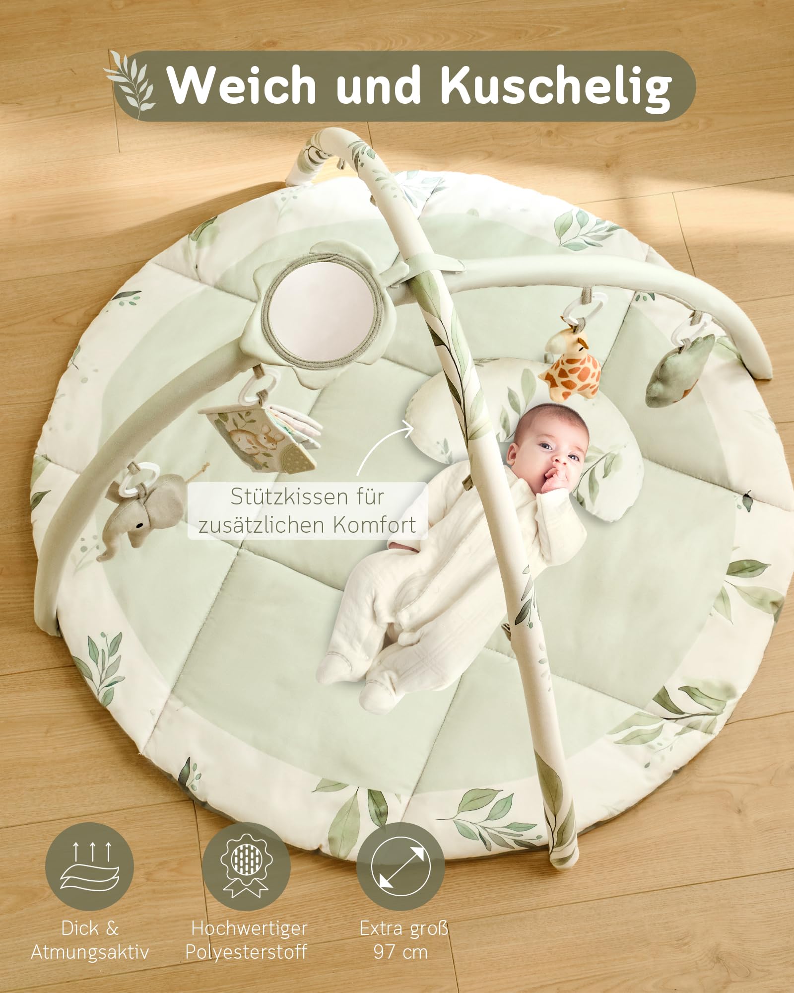Dieser liebevoll gestaltete Spielbogen verwandelt die wichtige Bauchlage in ein spannendes Abenteuer und fördert Ihr Baby von Geburt an auf spielerische und komfortable Weise.