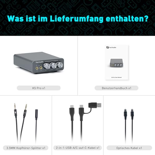 - Lieferumfang: K5 Pro Verstärker, 3,5-mm-Kopfhörer-Splitter, 2-in-1 USB-Kabel (A/C auf C), Optisches Kabel, Bedienungsanleitung, 24 Monate Garantie