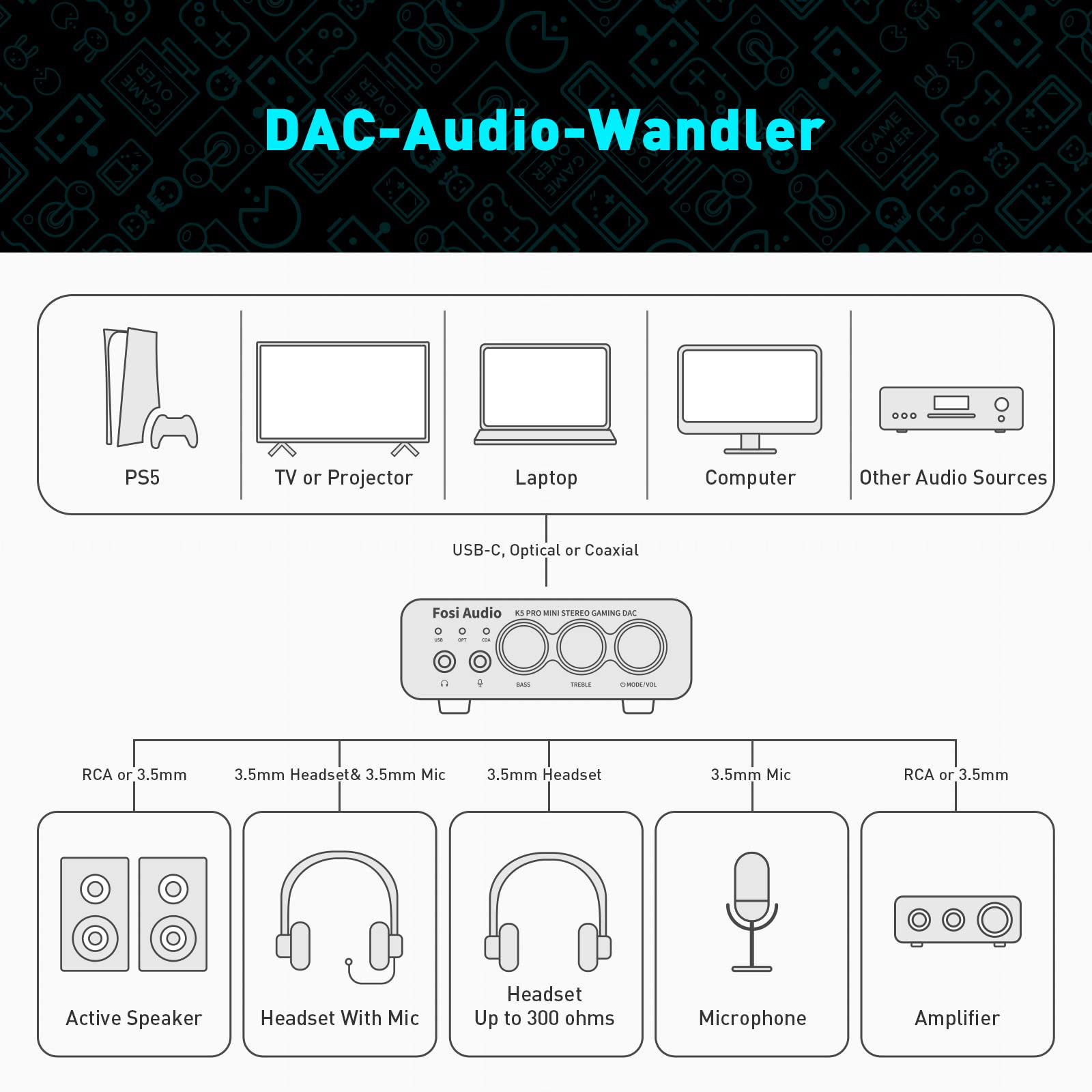 Der Fosi Audio K5 Pro ist ein vielseitiger Kopfhörerverstärker und DAC, der speziell entwickelt wurde, um Ihr Klangerlebnis am Computer oder an der Spielkonsole massgeblich zu verbessern. Er kombiniert audiophile Klangqualität mit praktischen Gaming-Funktionen in einem kompakten Gerät.