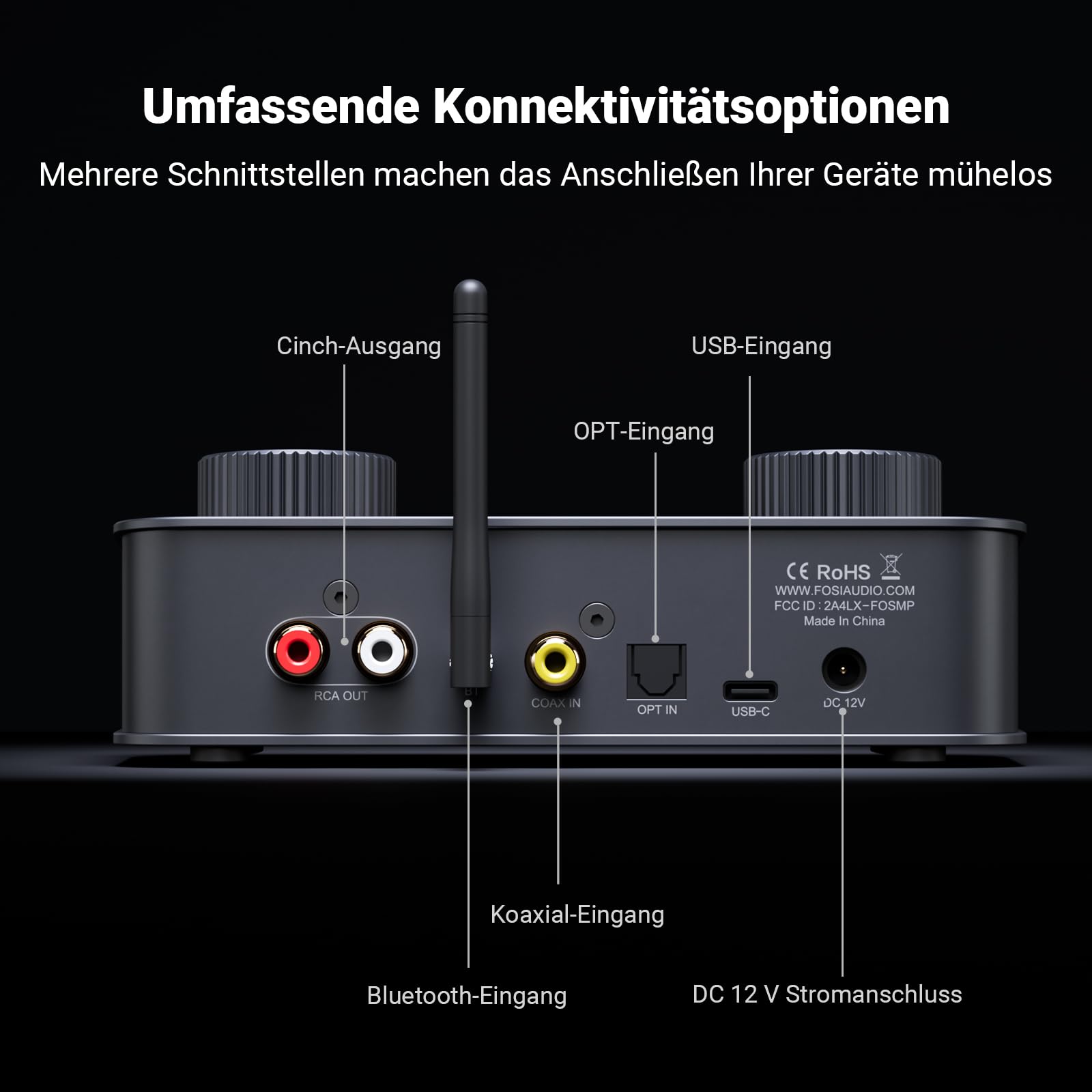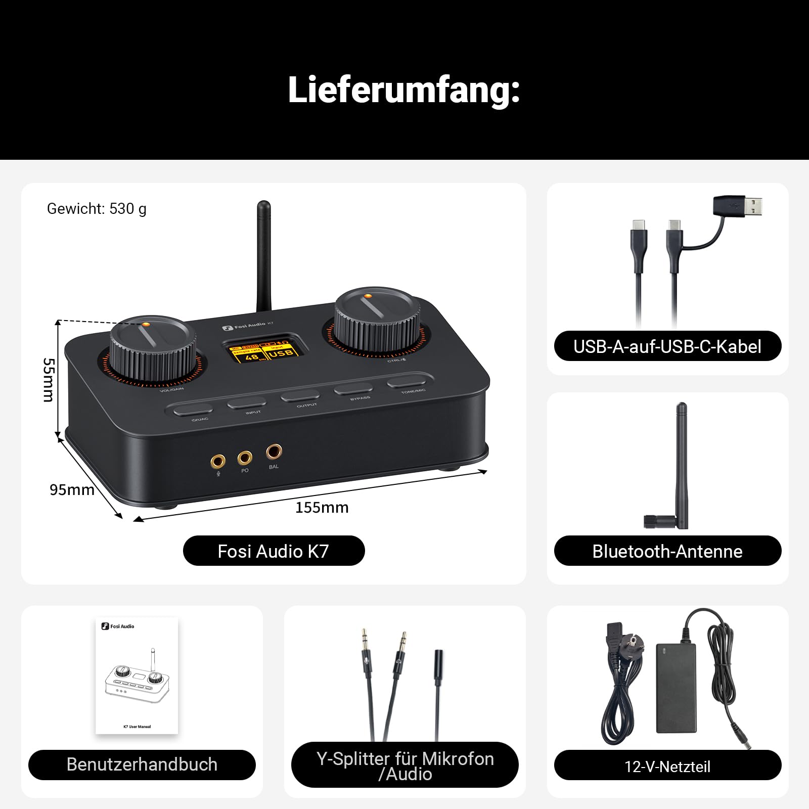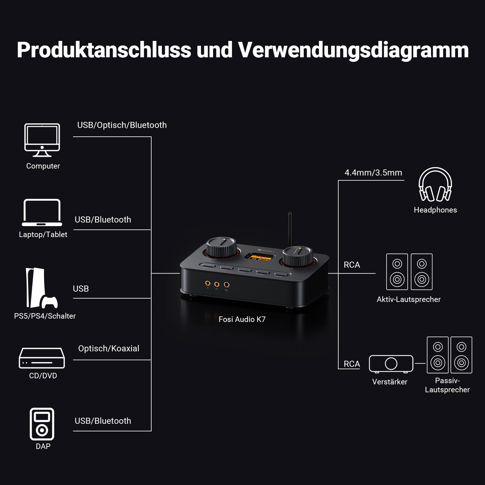 Der Fosi Audio K7 fungiert als leistungsstarke und flexible Schaltzentrale für Ihr gesamtes Desktop-Audiosystem. Er ist die ideale Lösung für anspruchsvolle Musikliebhaber, Gamer und alle, die bei der Arbeit Wert auf erstklassigen Klang legen.