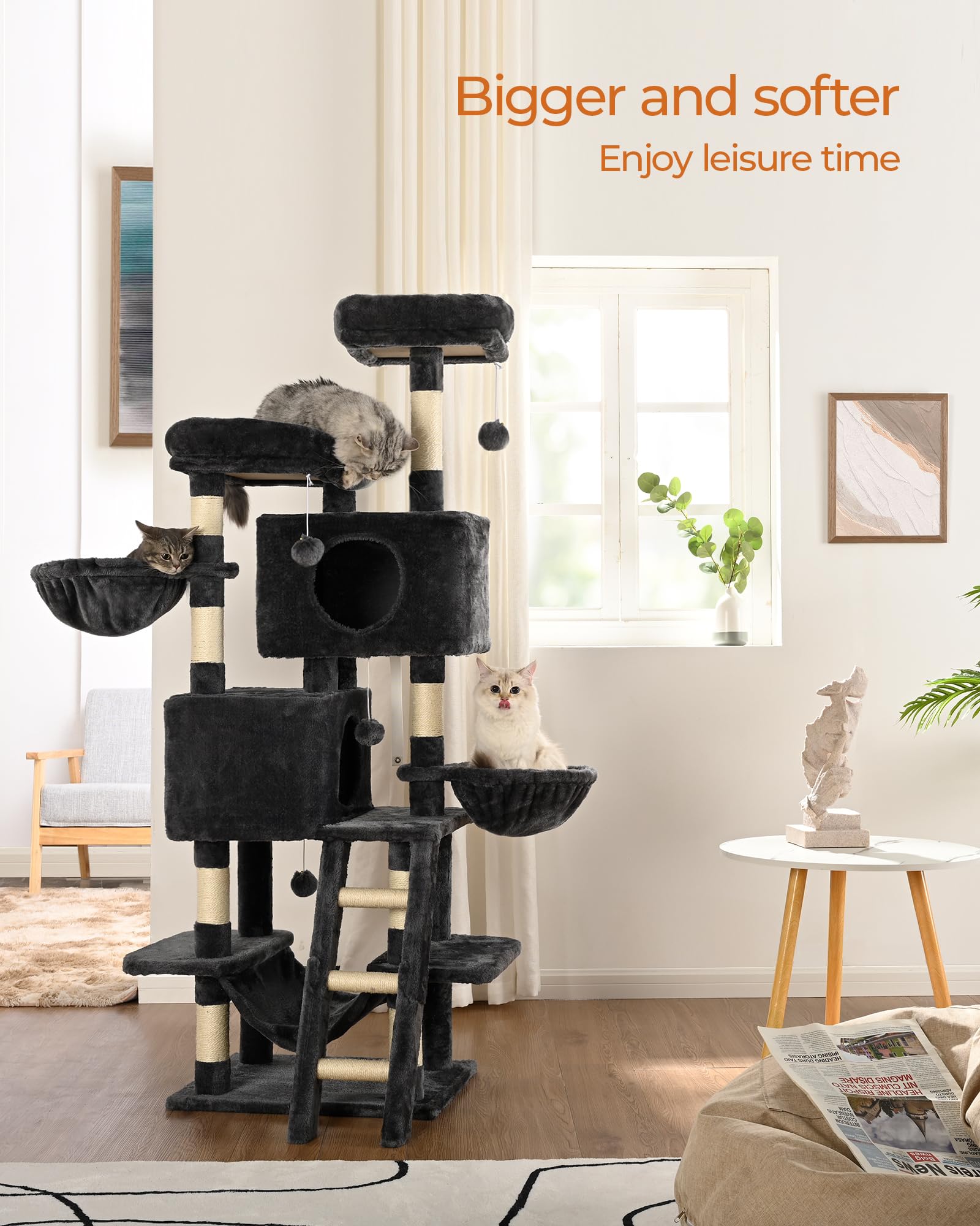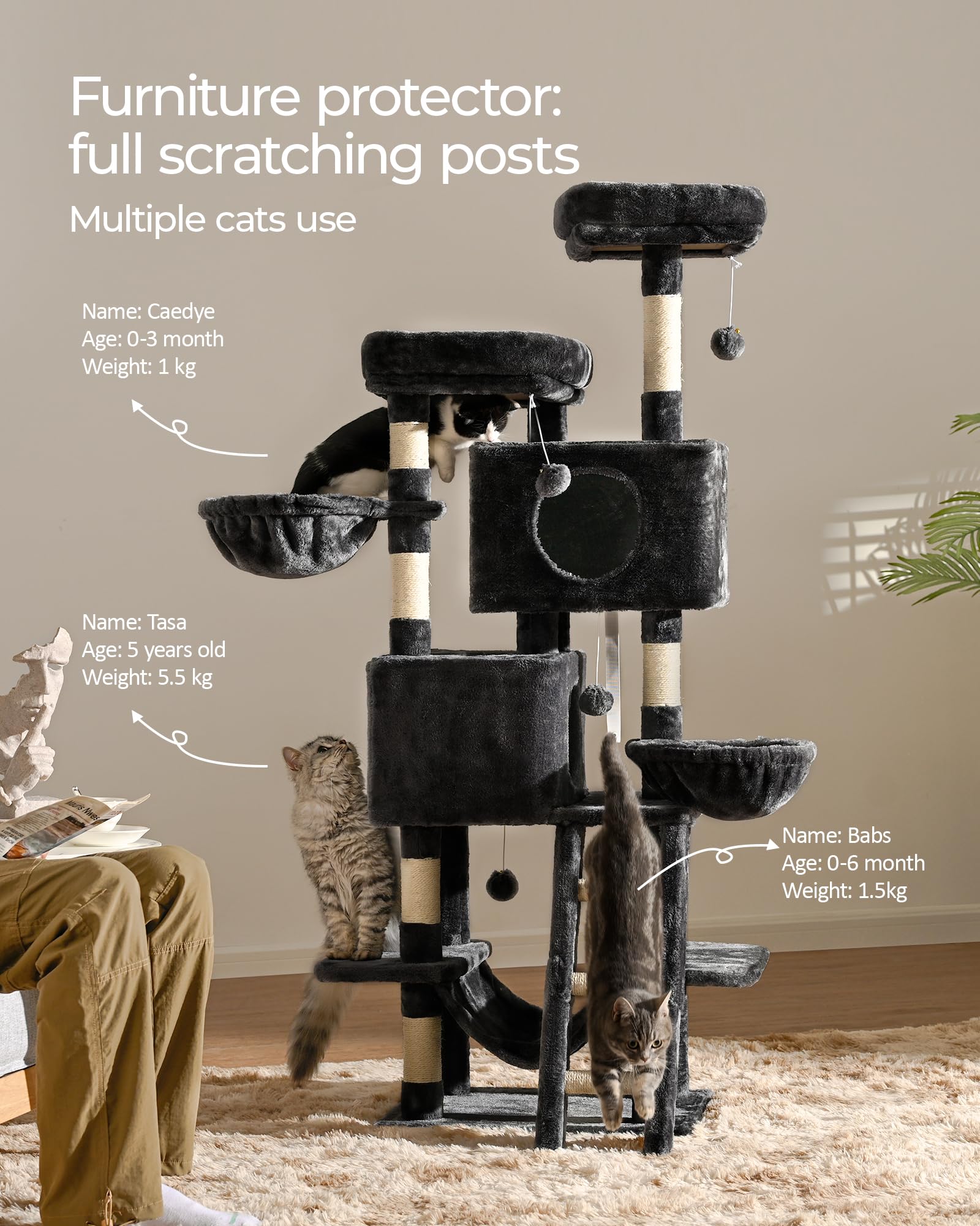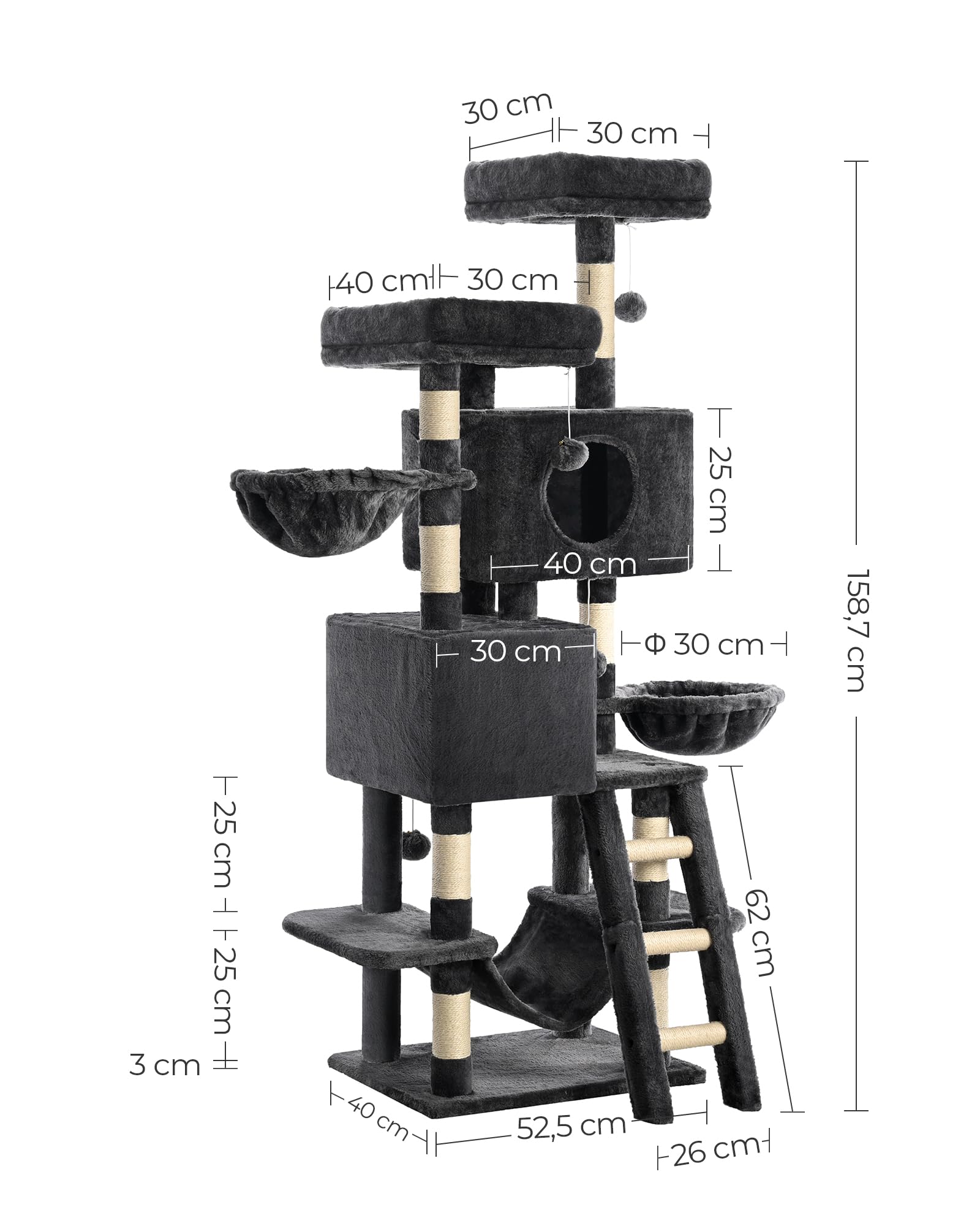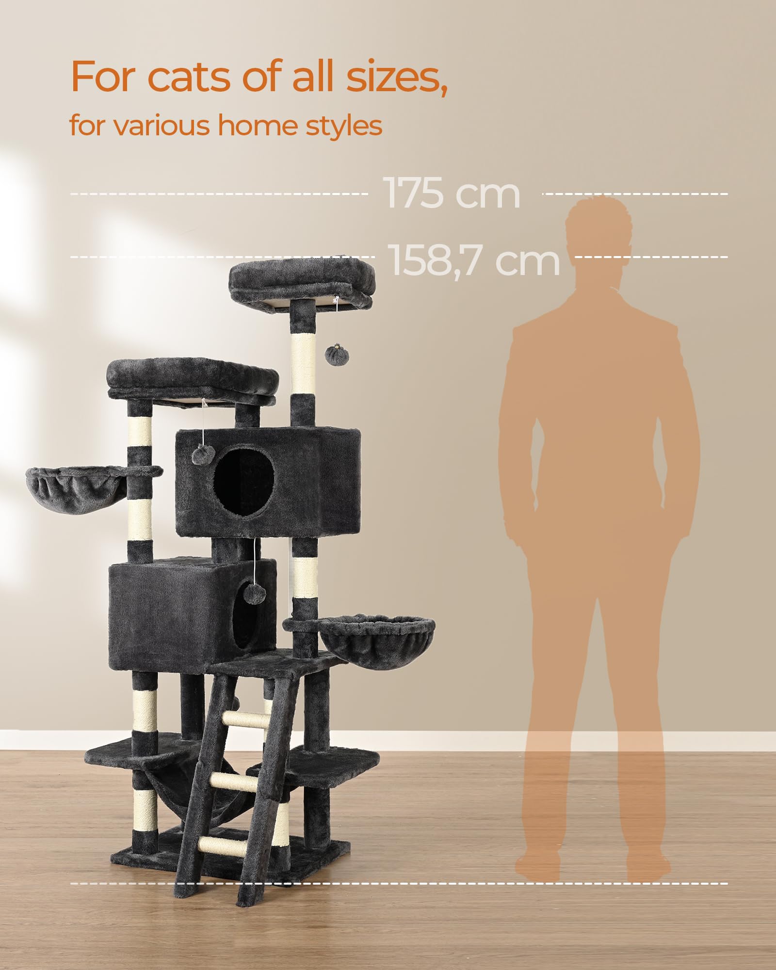 Dieser 160 cm hohe Kratzbaum ist ein komplettes Aktivitätszentrum, das Ihrer Katze ein wahres Paradies zum Klettern, Spielen und Ausruhen bietet. Das stilvolle Design in Rauchgrau fügt sich harmonisch in jede Wohnungseinrichtung ein.