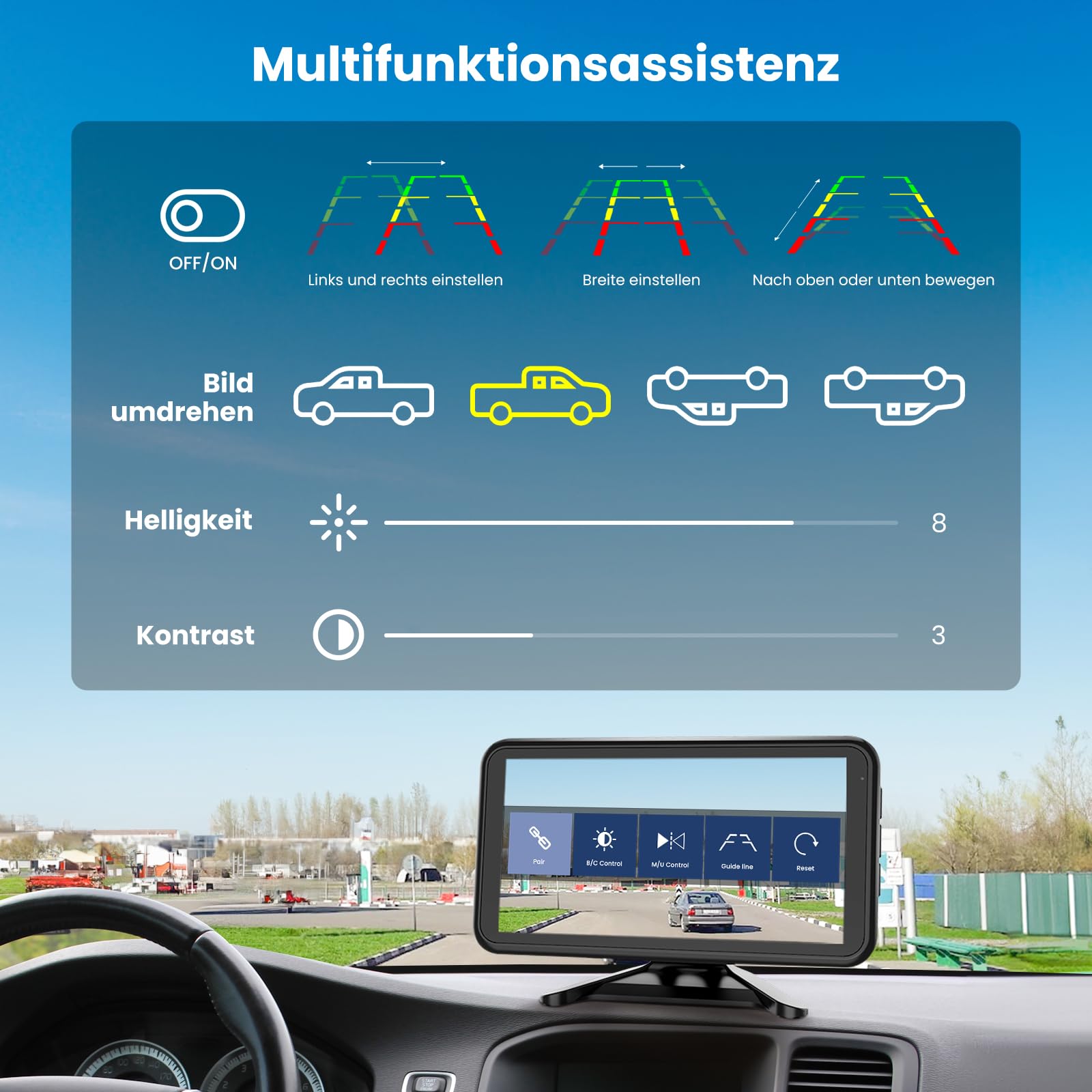 - Anpassbare Ansicht: Wählen Sie aus 6 verschiedenen Parkhilfslinien und passen Sie Helligkeit, Kontrast oder die Bildausrichtung (Spiegelung) individuell an Ihre Bedürfnisse an.