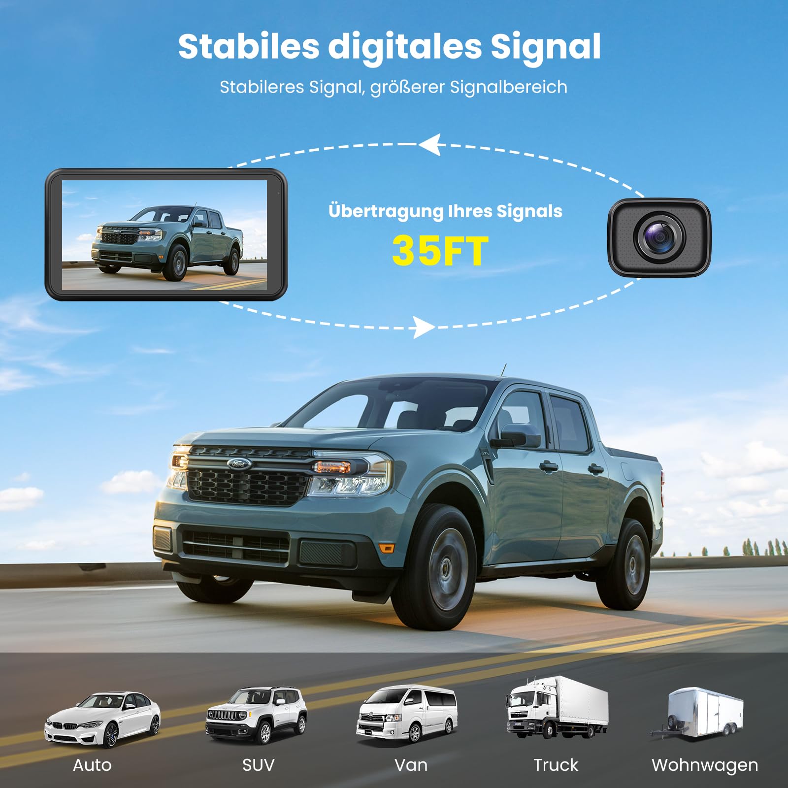 Das System ist universell konzipiert und eignet sich ideal zum Nachrüsten in einer Vielzahl von Fahrzeugen, darunter PKWs, Lastwagen, Wohnmobile und Anhänger, um die Sicherheit beim Manövrieren zu erhöhen.