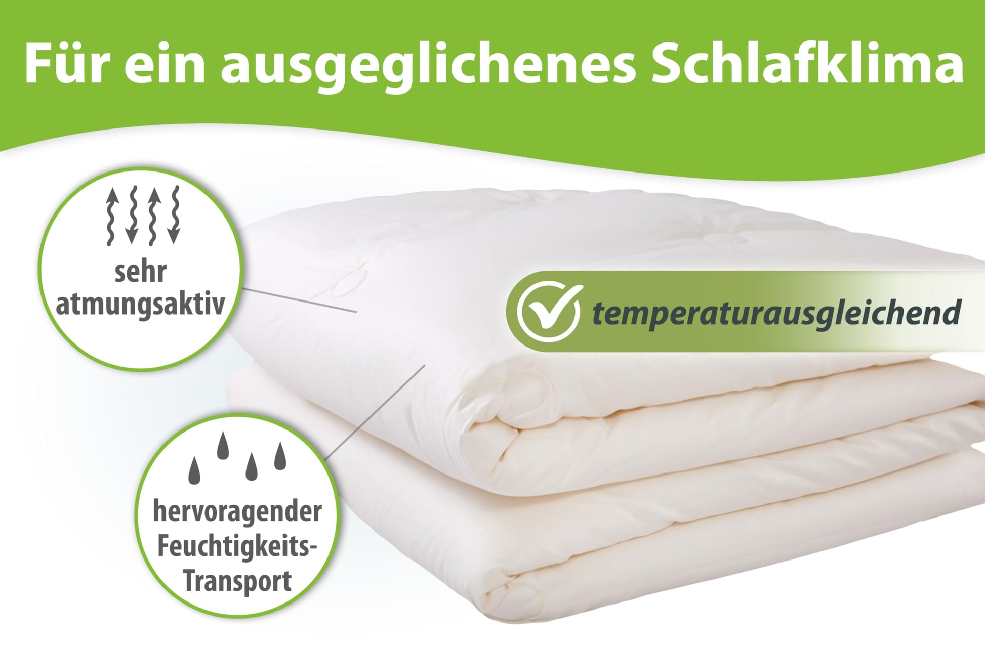 Sie ist ideal für Personen, die ein trockenes und hygienisches Schlafklima schätzen oder nachts zum Schwitzen neigen. Dank des exzellenten Feuchtigkeitsmanagements und der Atmungsaktivität von Lyocell bleibt die Decke angenehm trocken.