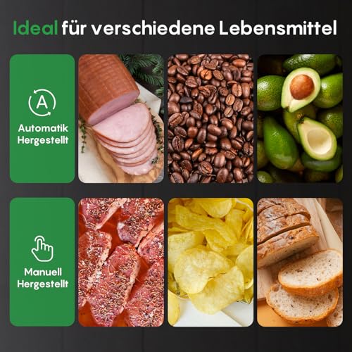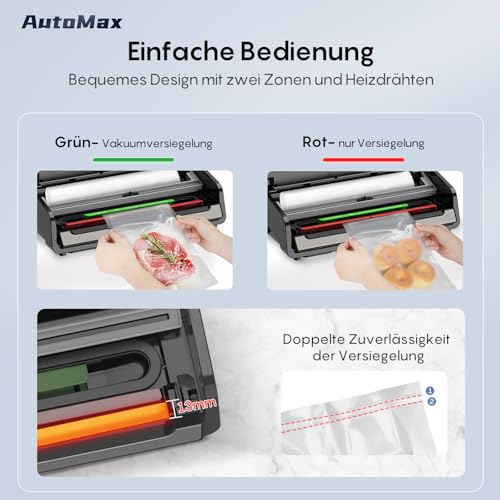 - Doppelte Schweissnaht: Ein bis zu 1,3 cm breiter, doppelt verstärkter Versiegelungsstreifen schützt Ihre Lebensmittel zuverlässig und verhindert effektiv das Eindringen von Luft.