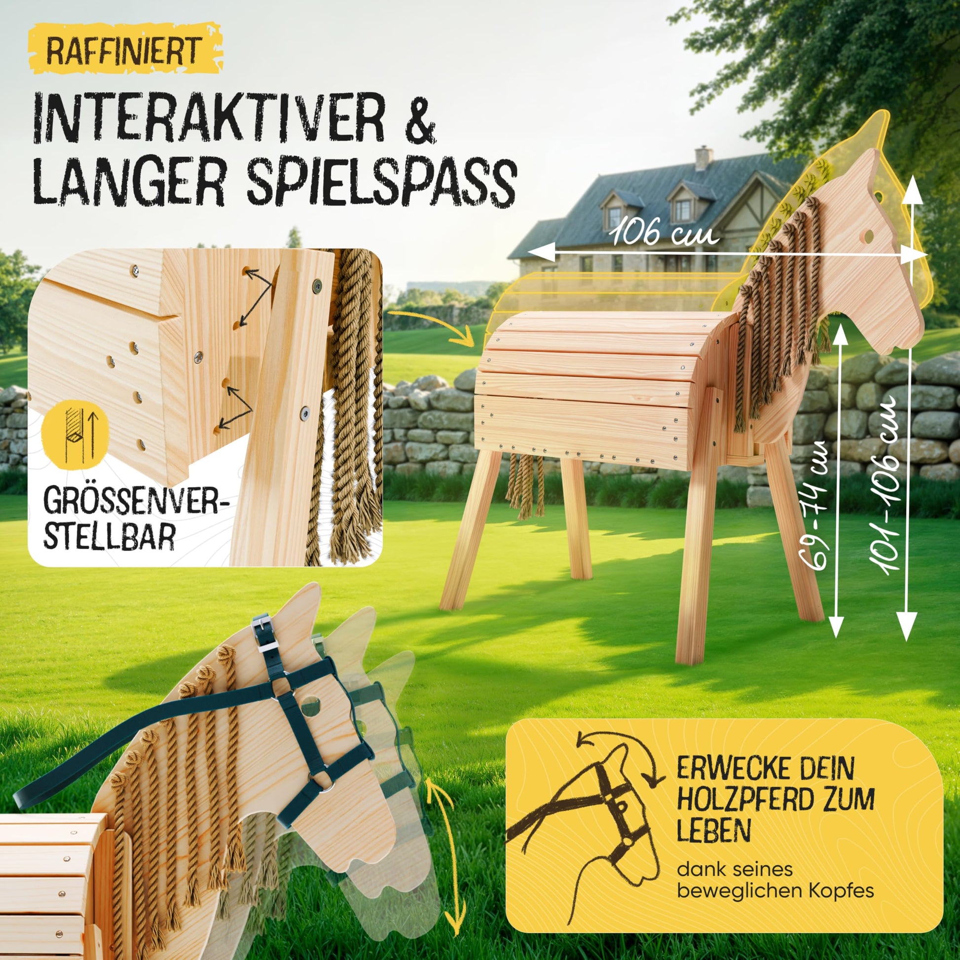 Das Holzpferd ist ideal für fantasievolle Abenteuer und wächst mit Ihrem Kind mit. Dank der verstellbaren Beine lässt sich die Kopfhöhe von 101 cm auf 106 cm anpassen, sodass es über viele Jahre ein treuer Spielgefährte bleibt.