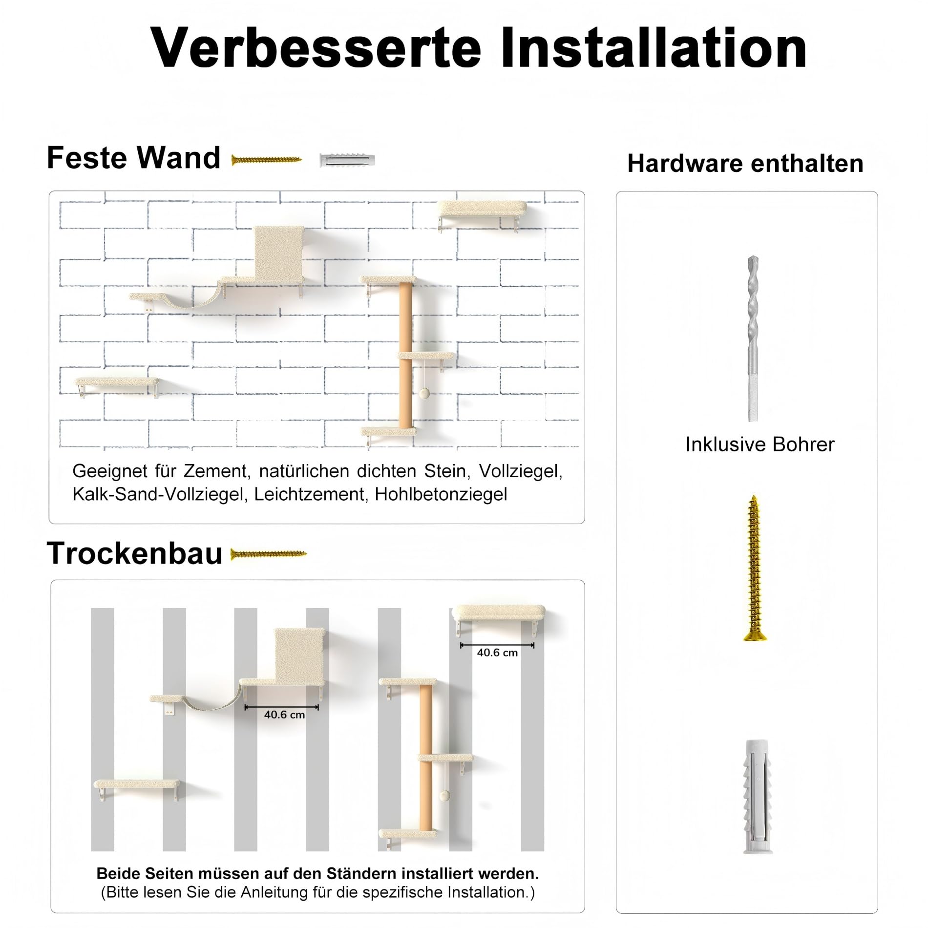Das Set eignet sich am besten für die Montage an massiven Wänden wie Beton oder Ziegel. Das gesamte benötigte Zubehör für eine Standard-Wandmontage sowie eine detaillierte Anleitung sind im Lieferumfang enthalten, um eine schnelle und sichere Installation zu ermöglichen. Bei Gipskartonwänden sollten zur Sicherheit spezielle Hohlraumdübel verwendet werden.