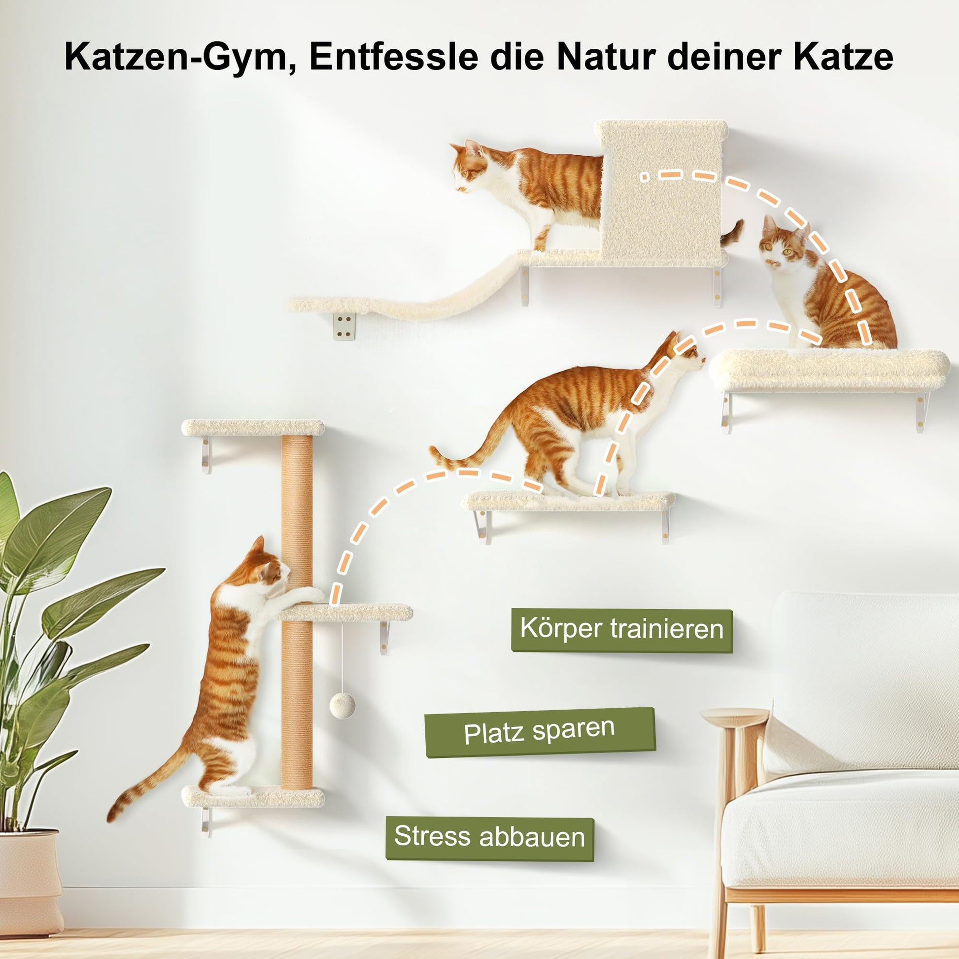 Nutzen Sie den vertikalen Raum Ihrer Wohnung optimal aus und sparen Sie wertvolle Bodenfläche. Indem Sie den Lebensraum Ihrer Katze an die Wand verlagern, schaffen Sie eine neue Dimension des Spiels, ohne Ihren Wohnbereich einzuschränken. Das stilvolle Design in dezentem Beige fügt sich zudem harmonisch in jeden Einrichtungsstil ein.