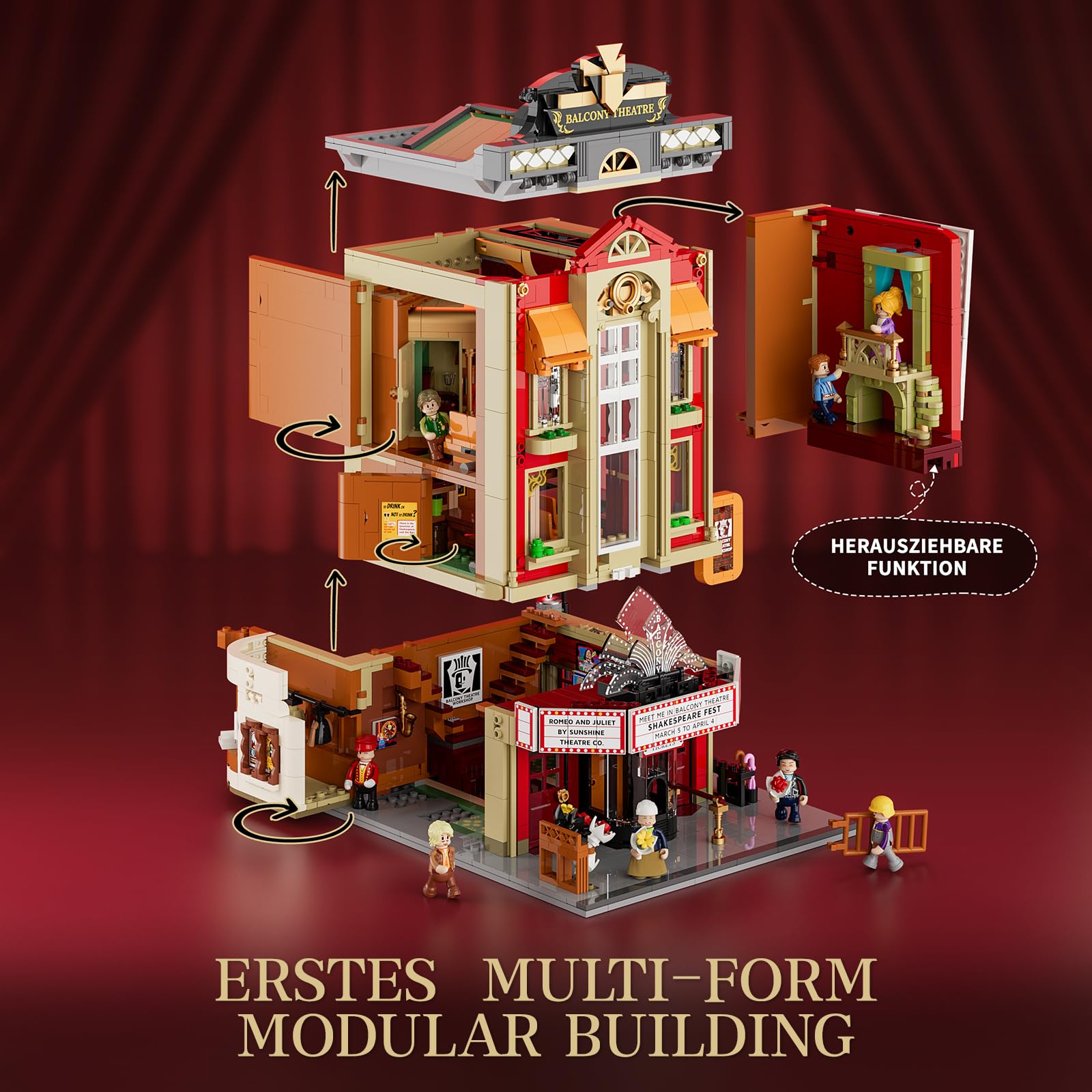 - Interaktiver Einblick: Dank des abnehmbaren Dachs, der drei offenen Wände und einer verschiebbaren Bühne erhalten Sie einen uneingeschränkten Einblick in das detailreiche Innenleben des Theaters und geniessen ein immersives Bauerlebnis.