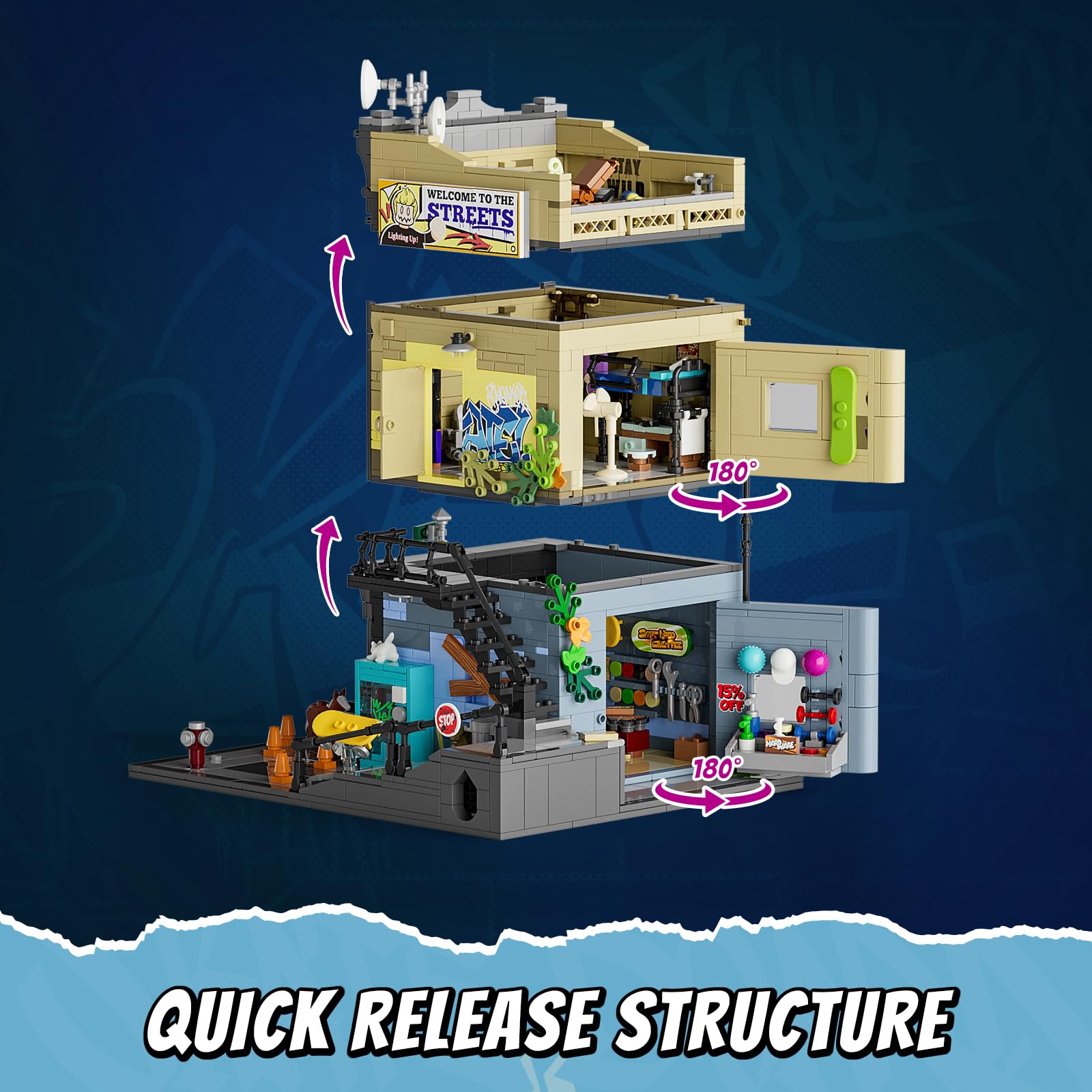 Tauchen Sie tief in die Welt der Strassenkultur ein. Die Vielzahl an Zubehörteilen und die detailgetreuen Szenarien ermöglichen ein immersives Bau- und Spielerlebnis, bei dem Sie authentische Skateboard-Szenen nachstellen können. Die durchdachte Architektur auf mehreren Ebenen bietet nicht nur abwechslungsreiche Spielmöglichkeiten, sondern macht das Modell auch zu einem eindrucksvollen Ausstellungsstück, das eine Geschichte erzählt.