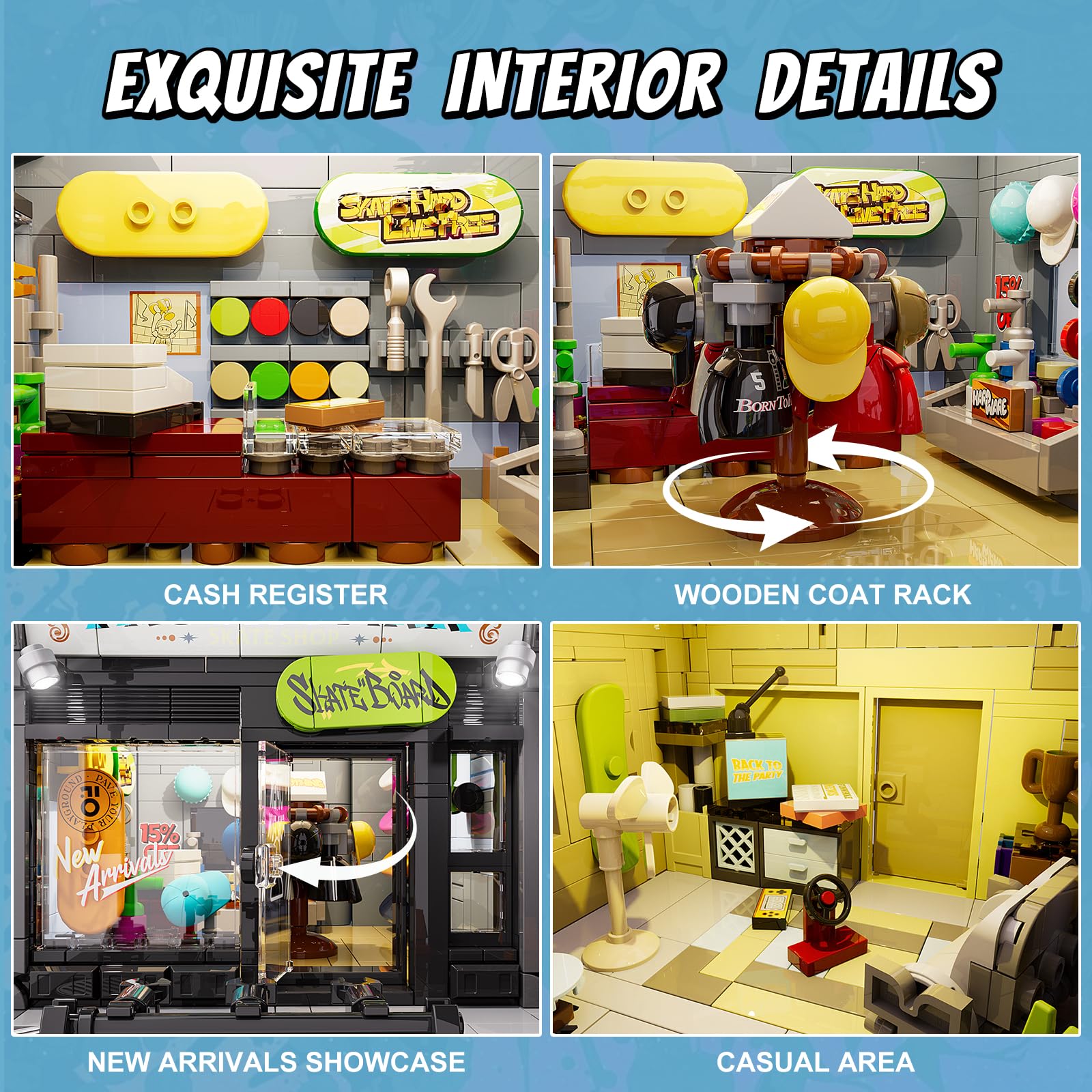 Das Set zeichnet sich durch seine Detailverliebtheit aus. Es umfasst 12 Kleidungsstücke und Hüte sowie 11 Skateboard-Accessoires zur individuellen Gestaltung. Das zweieinhalbstöckige Gebäude verfügt über einen Verkaufsbereich, eine Lounge mit Videospielen, einen Dachbereich für Partys und authentische Details wie einen Getränkeautomaten und Geländer.
