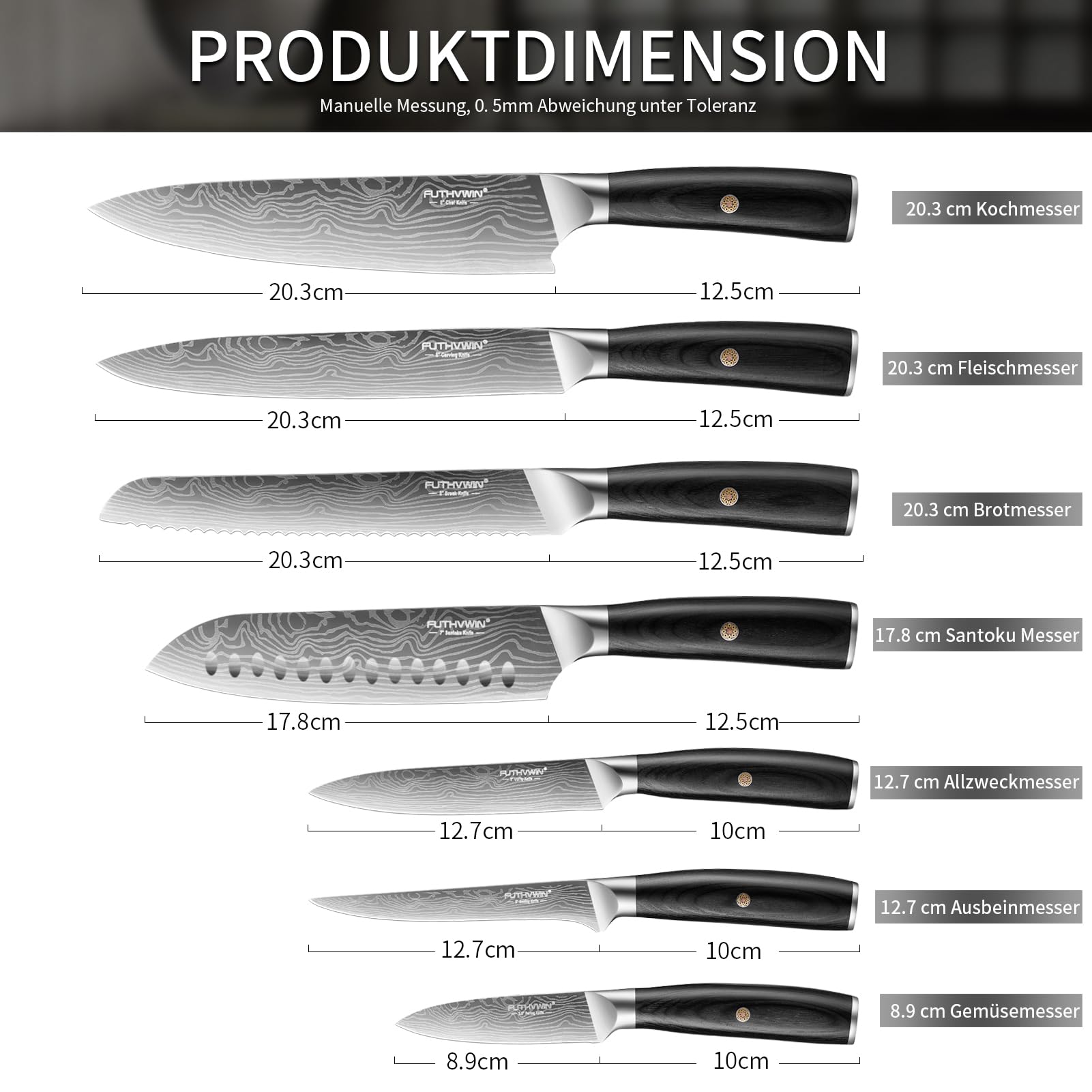 - Umfassendes 7-teiliges Set: Beinhaltet ein Kochmesser (20.3 cm), Brotmesser (20.3 cm), Santoku-Messer (17.8 cm), Fleischmesser (20.3 cm), Allzweckmesser (12.7 cm), Ausbeinmesser (12.7 cm) und ein Schälmesser (8.9 cm).