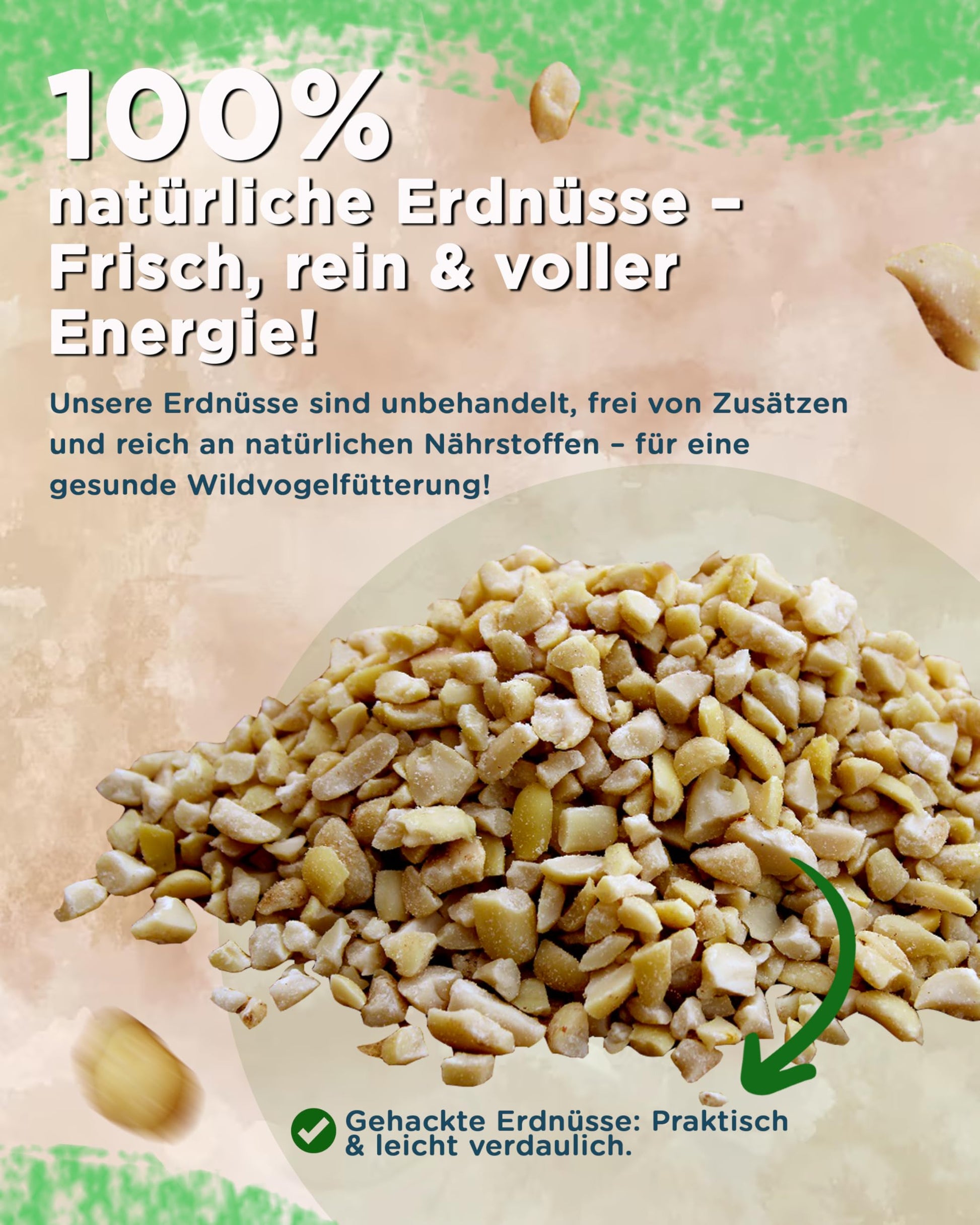 Die gehackte Form erleichtert kleineren Vogelarten die Nahrungsaufnahme und verhindert, dass sie an ganzen Kernen ersticken. Das Blanchieren (Entfernen der Haut) sorgt für eine erstklassige, weisse Qualität und macht die Erdnüsse leichter verdaulich.