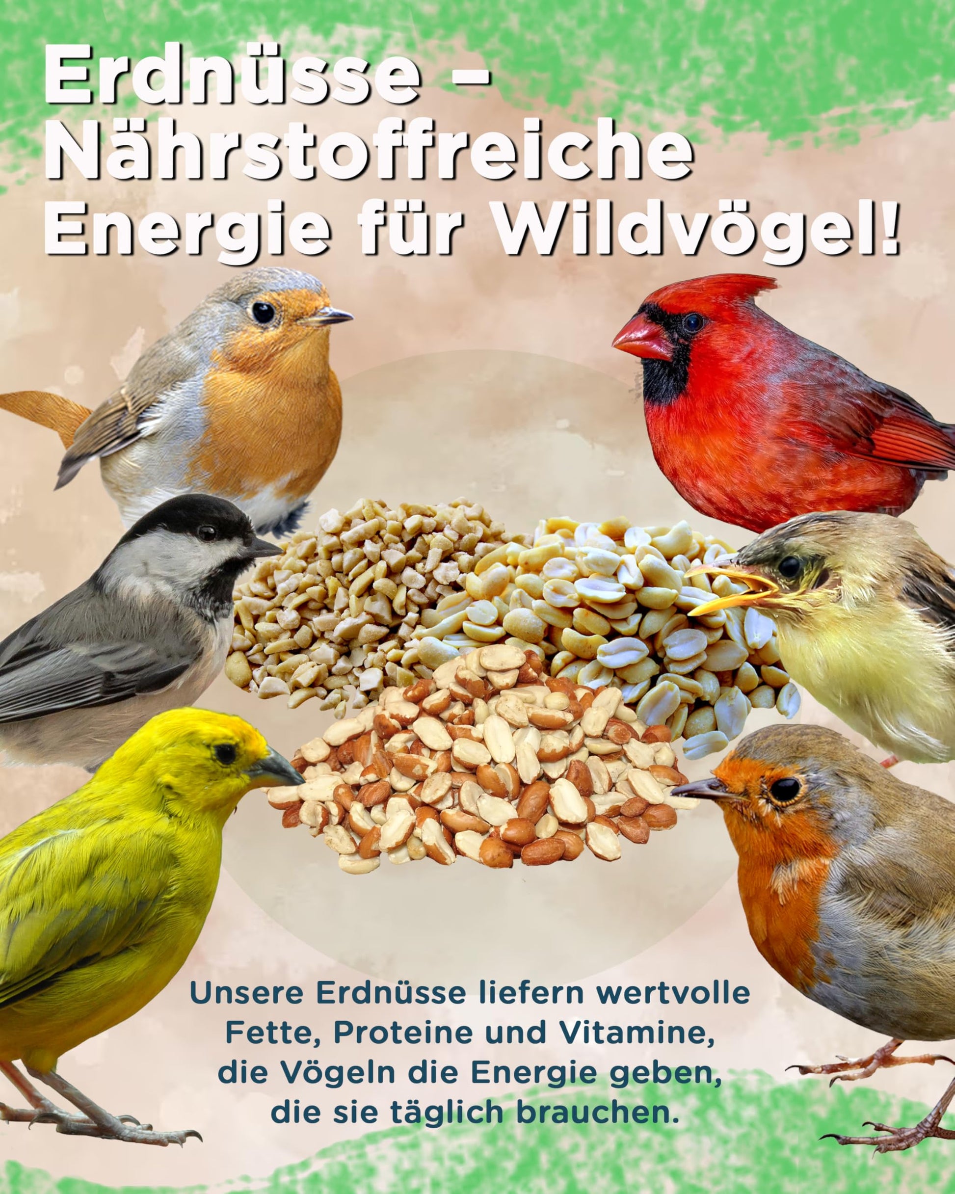 Die Erdnüsse sind eine ideale, energiereiche Nahrungsquelle für eine Vielzahl von Wildvögeln wie Meisen, Spechte und Kleiber, aber auch für Eichhörnchen. Die zerkleinerte Form ist besonders gut für die Schnäbel vieler Gartenvögel geeignet.
