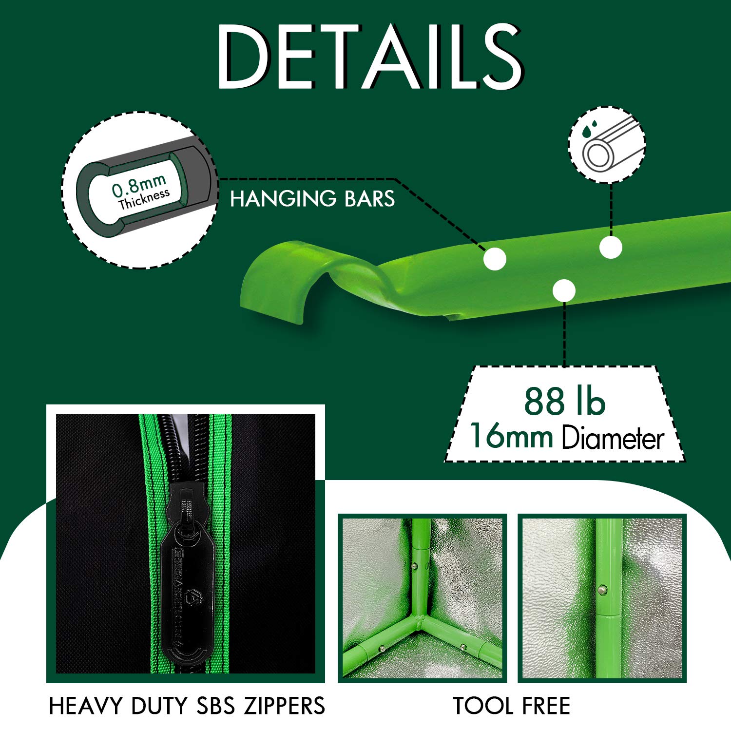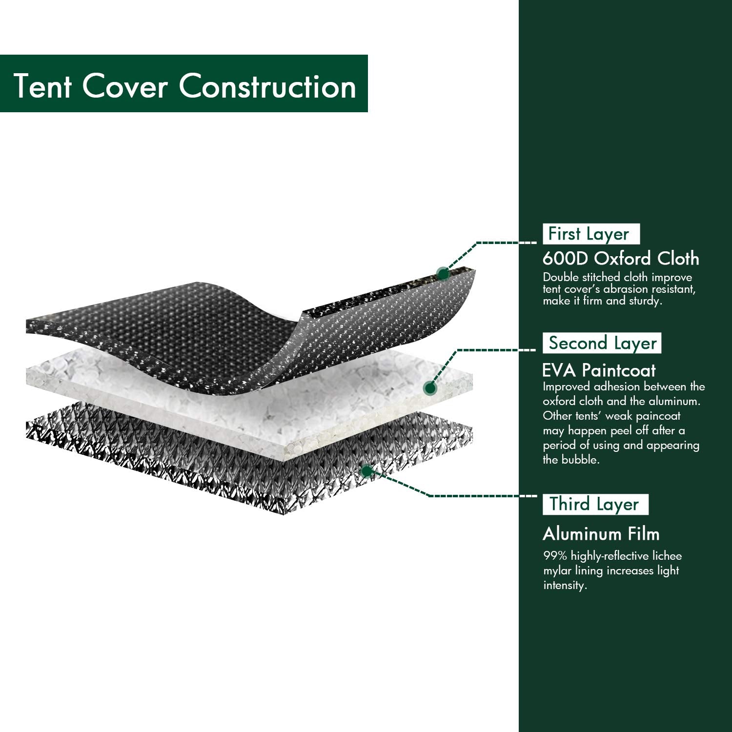 - Maximale Lichtreflexion: Das Zelt besteht aus robustem 600D Oxford-Gewebe und ist innen mit 98% reflektierendem Silber-Mylar ausgekleidet, um das gesamte Licht optimal auf Ihre Pflanzen zu lenken.