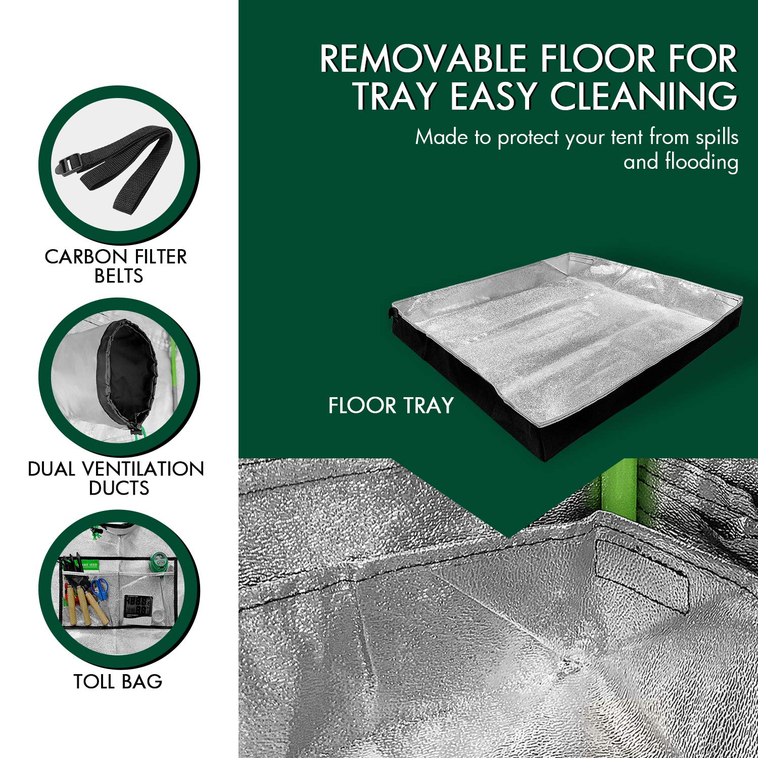 Die Innenseite ist mit 98% reflektierendem Silber-Mylar ausgekleidet. Diese hochreflektierende Oberfläche sorgt dafür, dass kein Licht verloren geht und es von allen Seiten auf Ihre Pflanzen gelenkt wird, was zu einem kräftigeren und gesünderen Wachstum führt.