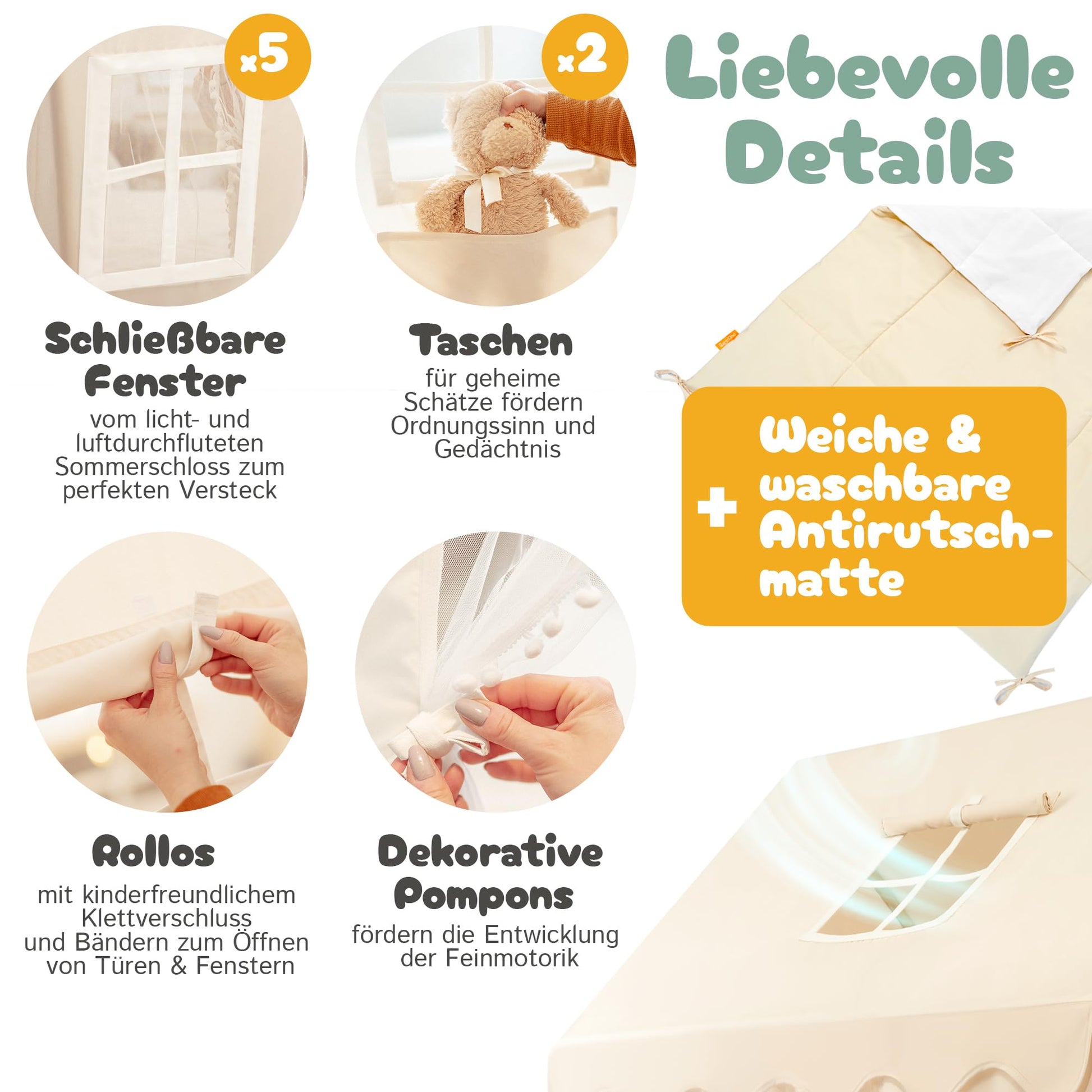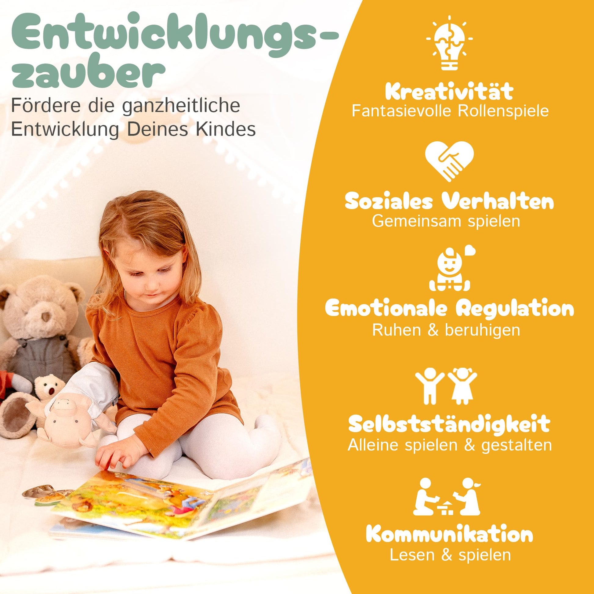 Fördert Kreativität und Entwicklung: Dieses Kinderzelt ist weit mehr als nur ein Spielzeug. Es ist ein pädagogisch wertvoller Raum, der die Fantasie anregt und zu kreativen Rollenspielen animiert. Ihr Kind kann hier seine Selbstständigkeit entfalten, soziale Fähigkeiten im Spiel mit anderen erlernen und einen sicheren Ort finden, der Geborgenheit schenkt und die emotionale Entwicklung unterstützt.