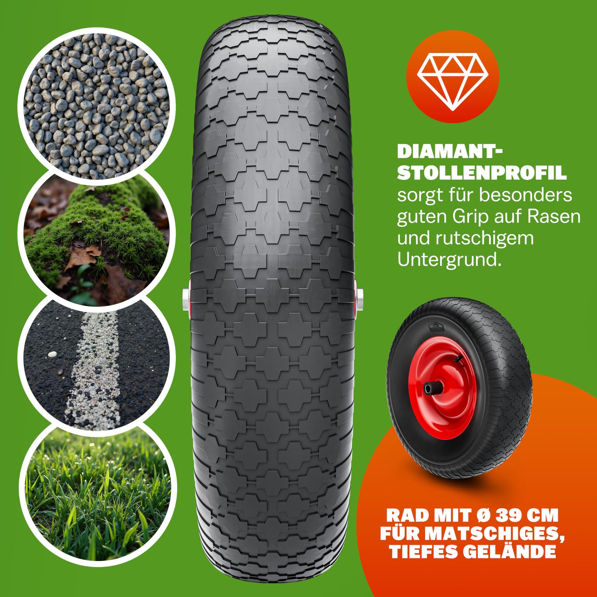 - Geländegängiges Luftrad: Ein 40 cm grosses Rad mit griffigem Stollenprofil sorgt für besten Halt und leichtes Manövrieren, auch auf matschigem oder unebenem Untergrund.