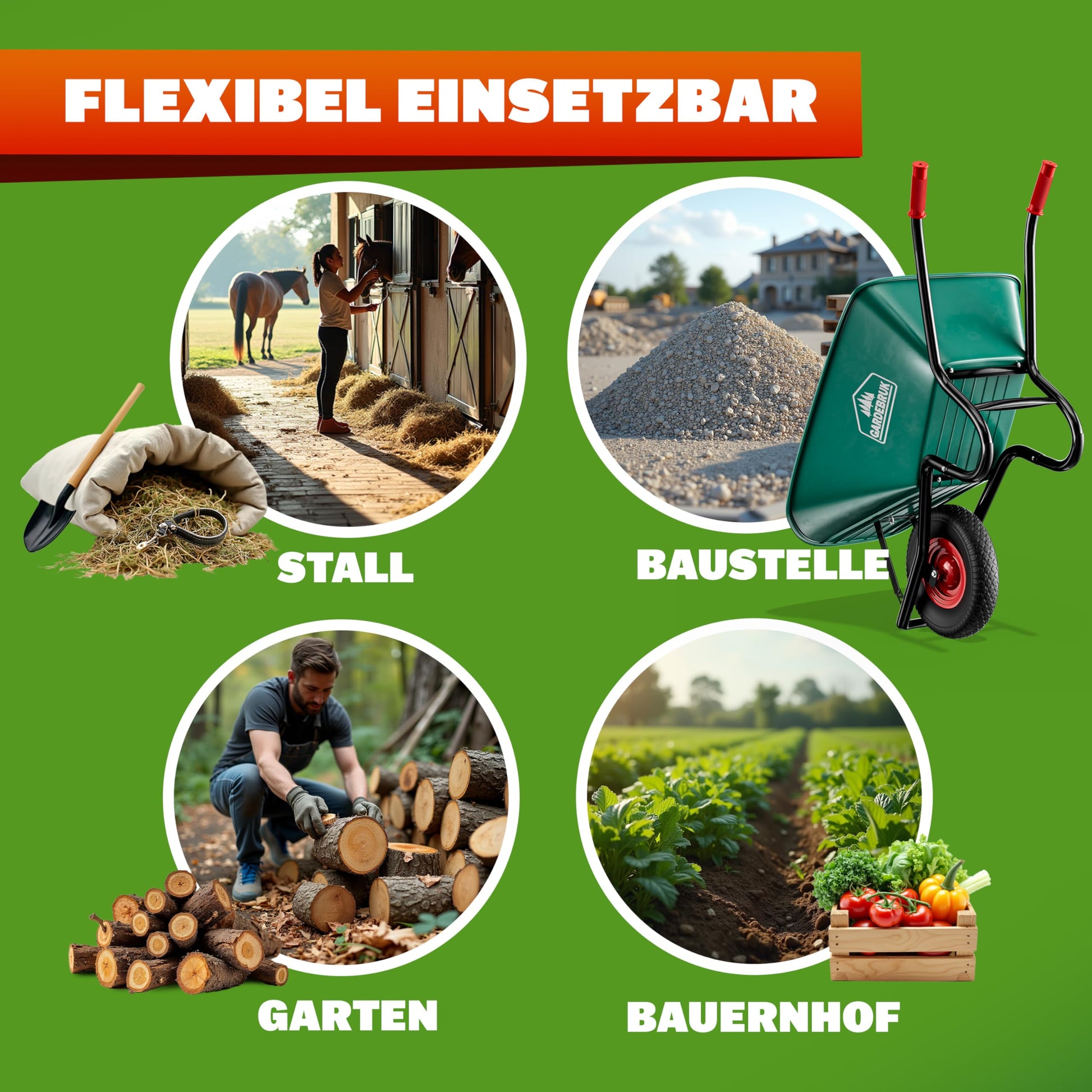 Die Gardebruk Schubkarre ist für anspruchsvolle Aufgaben konzipiert. Sie verfügt über eine grosse 100-Liter-Wanne und kann mit bis zu 250 kg beladen werden, ideal für schwere Materialien wie Steine, Erde oder Baumaterial.