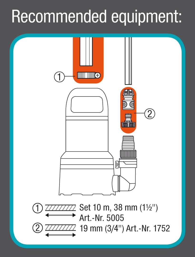 Das Schnellkupplungssystem ist für Schläuche mit 25 mm (1 Zoll) und 38 mm (1 ½ Zoll) ausgelegt. Über das G1-Zoll-Gewinde können auch Gartenschläuche verbunden werden. Für maximale Effizienz wird die Verwendung von grossformatigen Schläuchen ab 25 mm (1 Zoll) empfohlen.