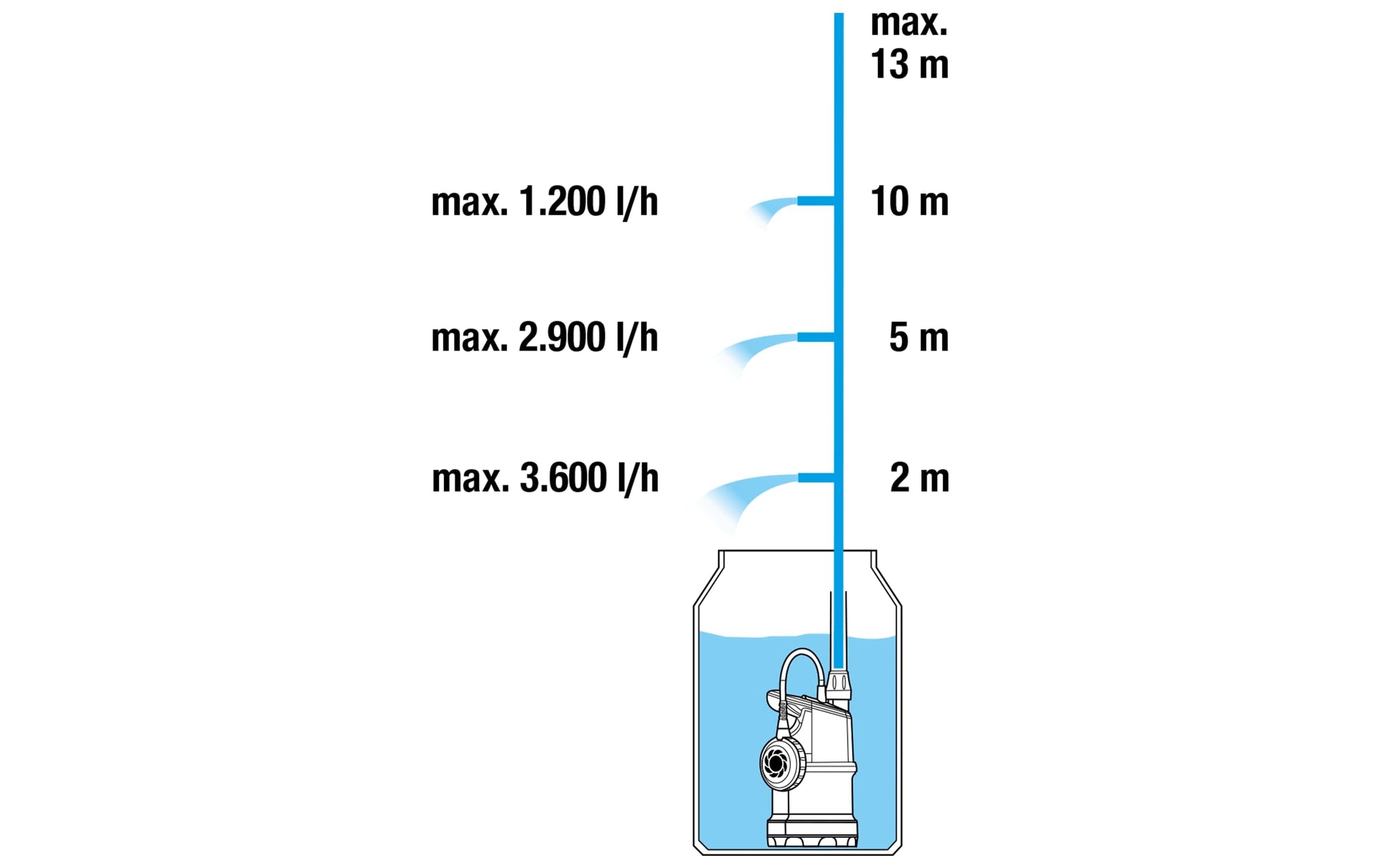 - Hohe Förderleistung: Mit einem Druck von 1,3 bar bewegt die Pumpe zuverlässig und schnell bis zu 4'000 Liter Wasser pro Stunde.