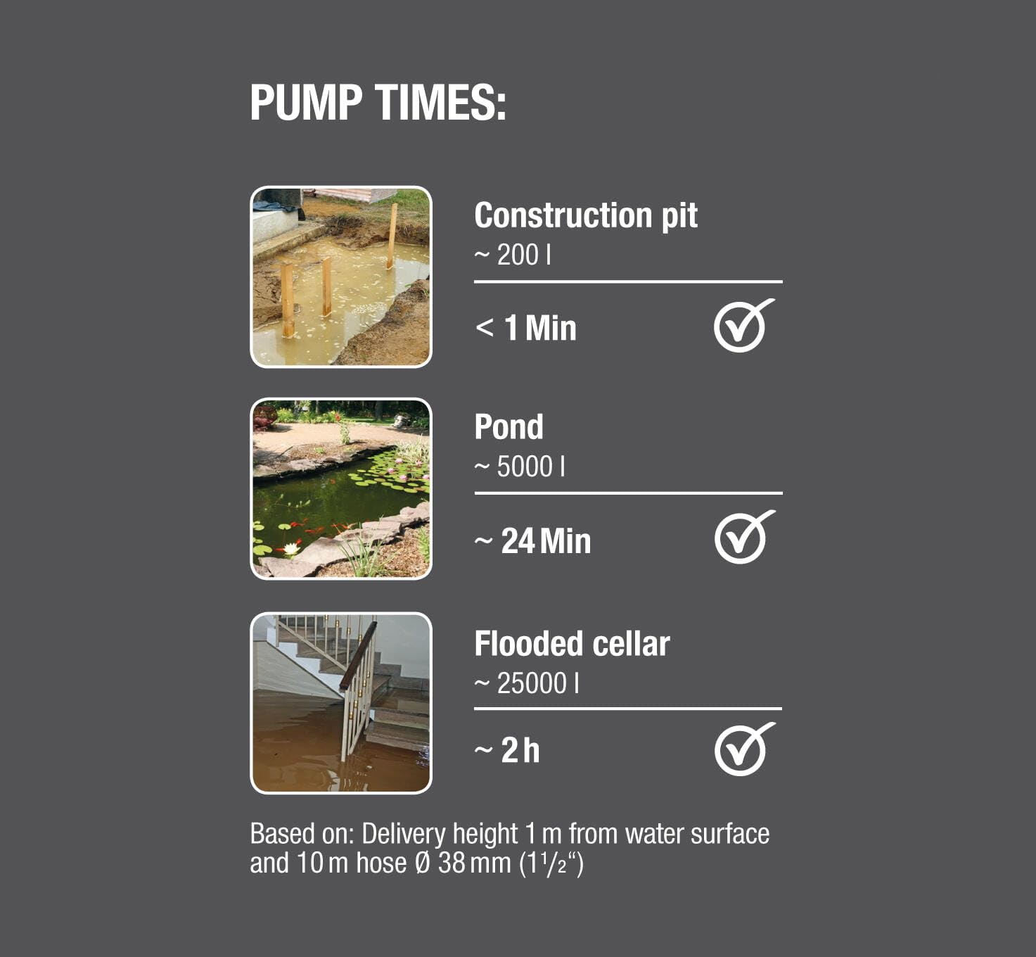 Die Pumpe ist ideal für stark verschmutztes Wasser und bewältigt mühelos Schmutzpartikel mit einer Korngrösse von bis zu 35 mm. Das macht sie perfekt zum Entwässern von Baugruben, Gartenteichen oder überfluteten Kellern.