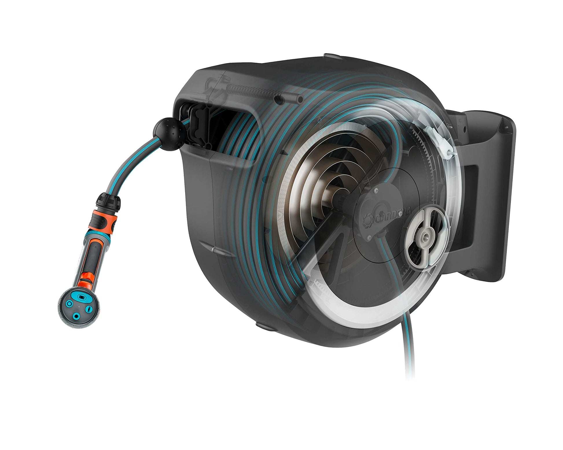 - Automatische Aufroll-Technologie: Ein kurzer Zug am Schlauch genügt, und die integrierte Stahlfeder mit Fliehkraftbremse rollt den 30 Meter langen Schlauch sicher und gleichmässig wieder auf.