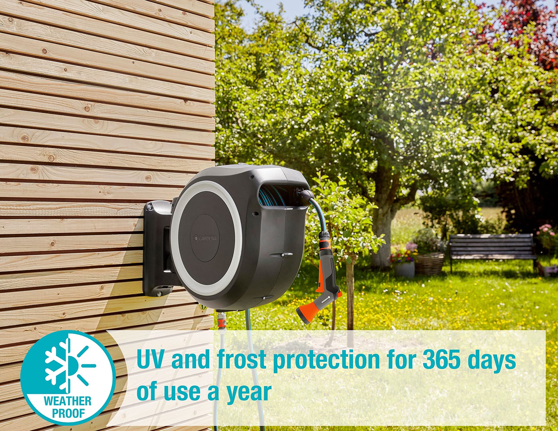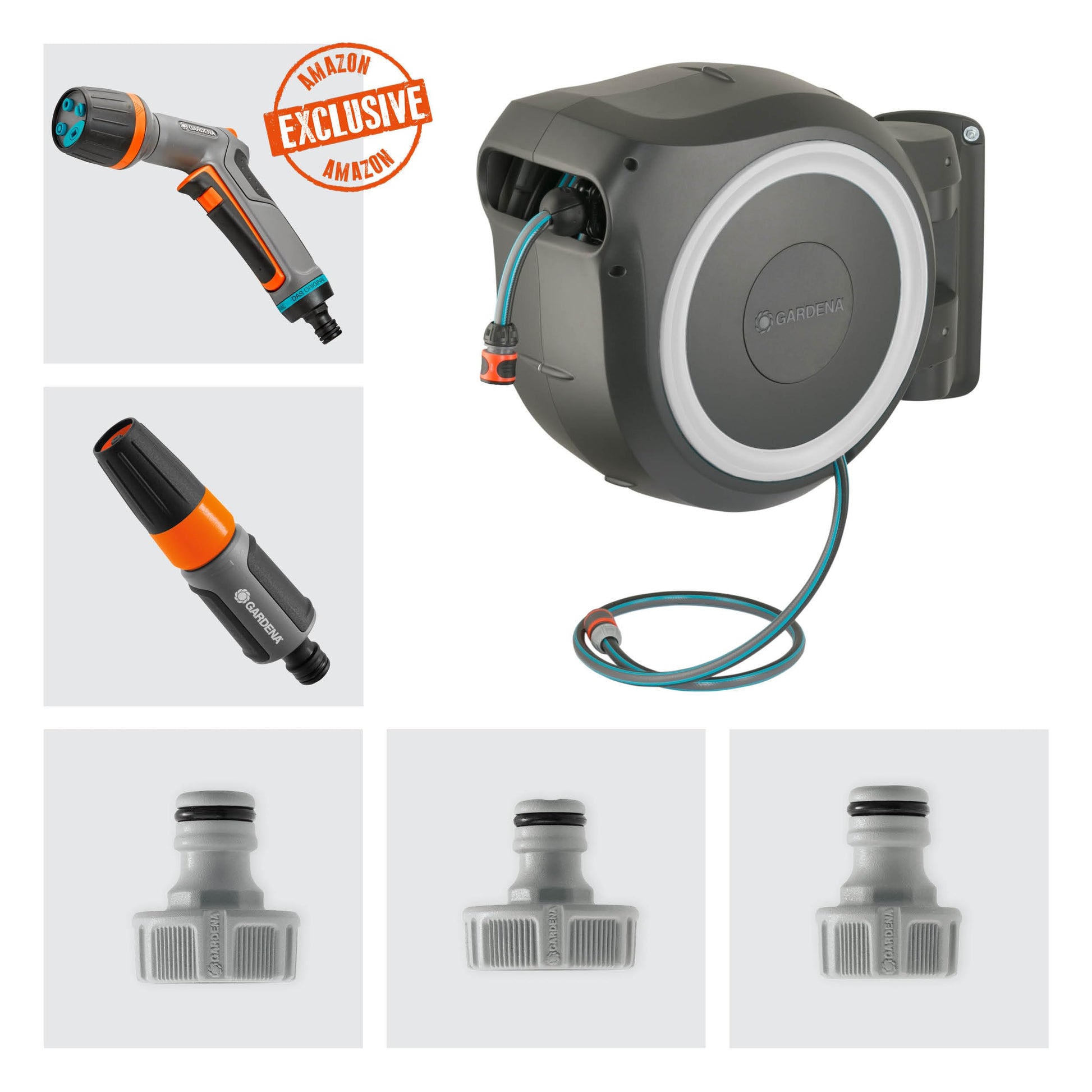 Das Set ist sofort einsatzbereit und beinhaltet die Wand-Schlauchbox, einen 30 Meter langen Gardena Qualitätsschlauch (13 mm), einen flexiblen Anschlussschlauch, eine Reinigungsspritze, eine Comfort Multi-Reinigungsspritze (Brause) sowie das komplette Montagematerial für die Wandhalterung.