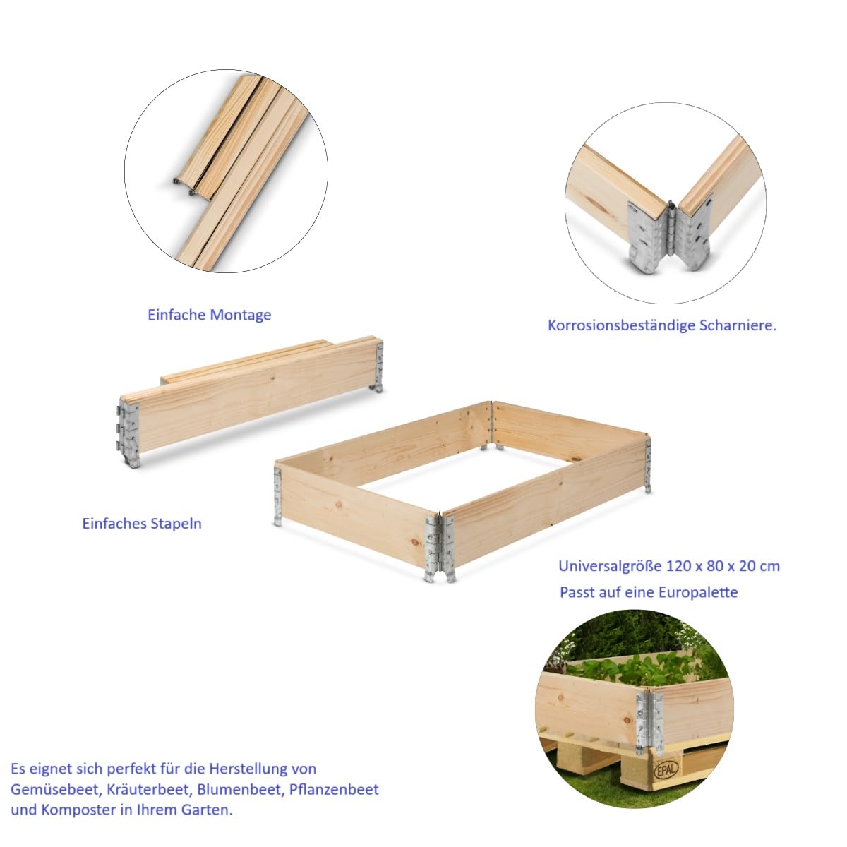 - Flexibel und stapelbar: Das Set besteht aus drei einzelnen Rahmen, die einfach übereinandergestapelt werden können, um eine Gesamthöhe von 60 cm zu erreichen. Die Masse passen exakt auf eine Standard-Europalette.