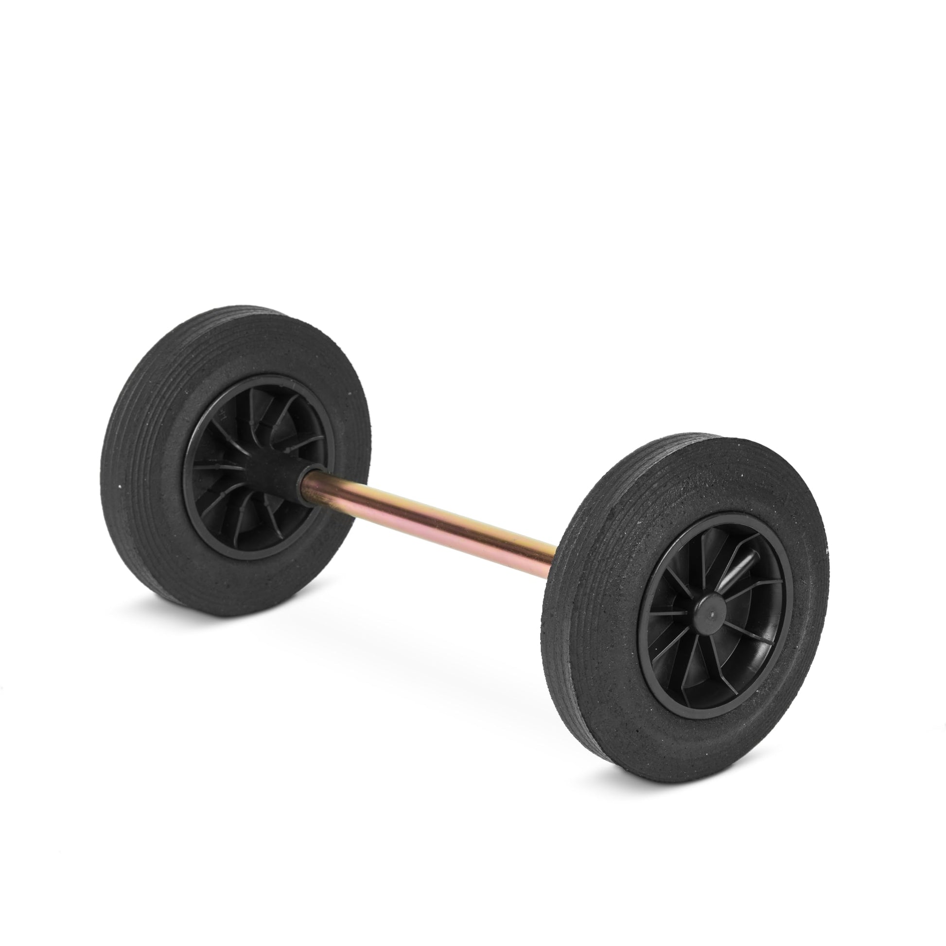 - Fahrwerk: Stabile Stahlachse mit zwei grossen, geräuscharmen Vollgummirädern