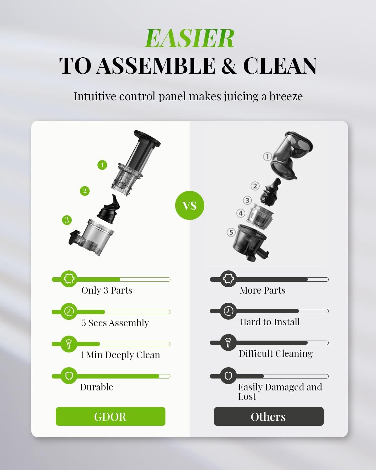 Entdecken Sie die Freude an frisch gepressten, nährstoffreichen Säften mit dem kompakten Slow Juicer von GDOR. Dieses leistungsstarke Gerät wurde für eine maximale Saftausbeute und eine besonders einfache Handhabung in Ihrer Küche konzipiert.