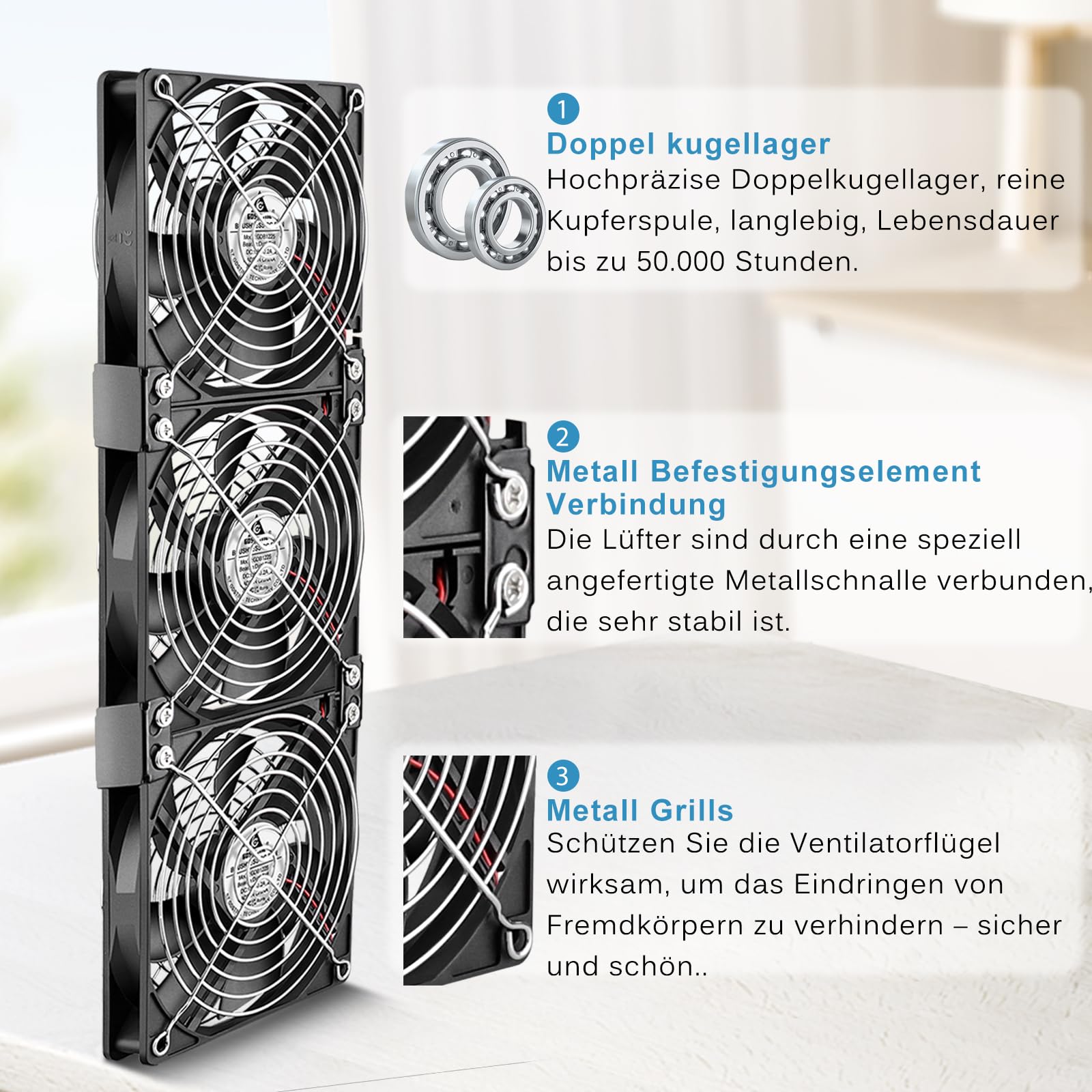 Dieses Set aus drei miteinander verbundenen 120-mm-Lüftern ist eine kraftvolle und grossflächige Kühleinheit, die direkt mit 230V Netzspannung betrieben wird. Es bietet eine flexible und effiziente Lösung zur Belüftung von Computern, Serverschränken und anderen elektronischen Geräten.