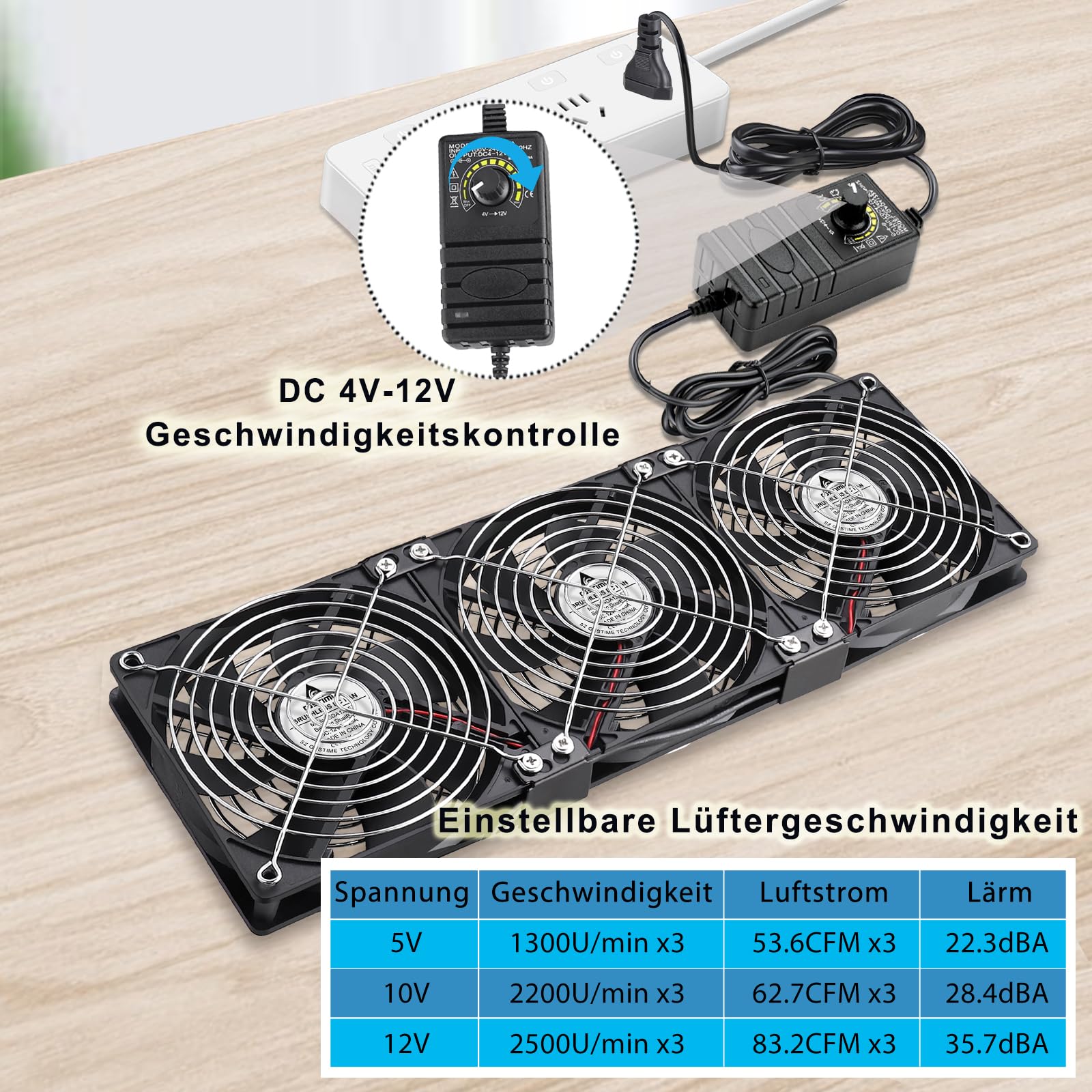 Die grösste Stärke dieses Lüfter-Sets liegt in seiner Anpassungsfähigkeit. Mit dem mitgelieferten, stufenlosen Drehzahlregler können Sie die Spannung von 4V bis 12V präzise justieren. Dadurch lässt sich die Rotationsgeschwindigkeit, der Luftstrom und die Geräuschentwicklung exakt auf Ihre individuellen Anforderungen abstimmen – von flüsterleise bis zur maximalen Kühlleistung.
