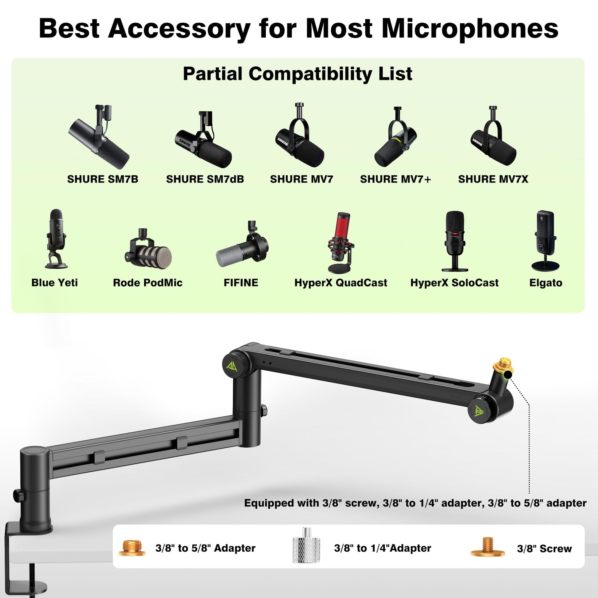 - Universelle Kompatibilität: Im Lieferumfang sind Adapter von 3/8″ auf 5/8″ sowie von 3/8″ auf 1/4″ enthalten, was den Arm mit praktisch allen gängigen Mikrofonen kompatibel macht.