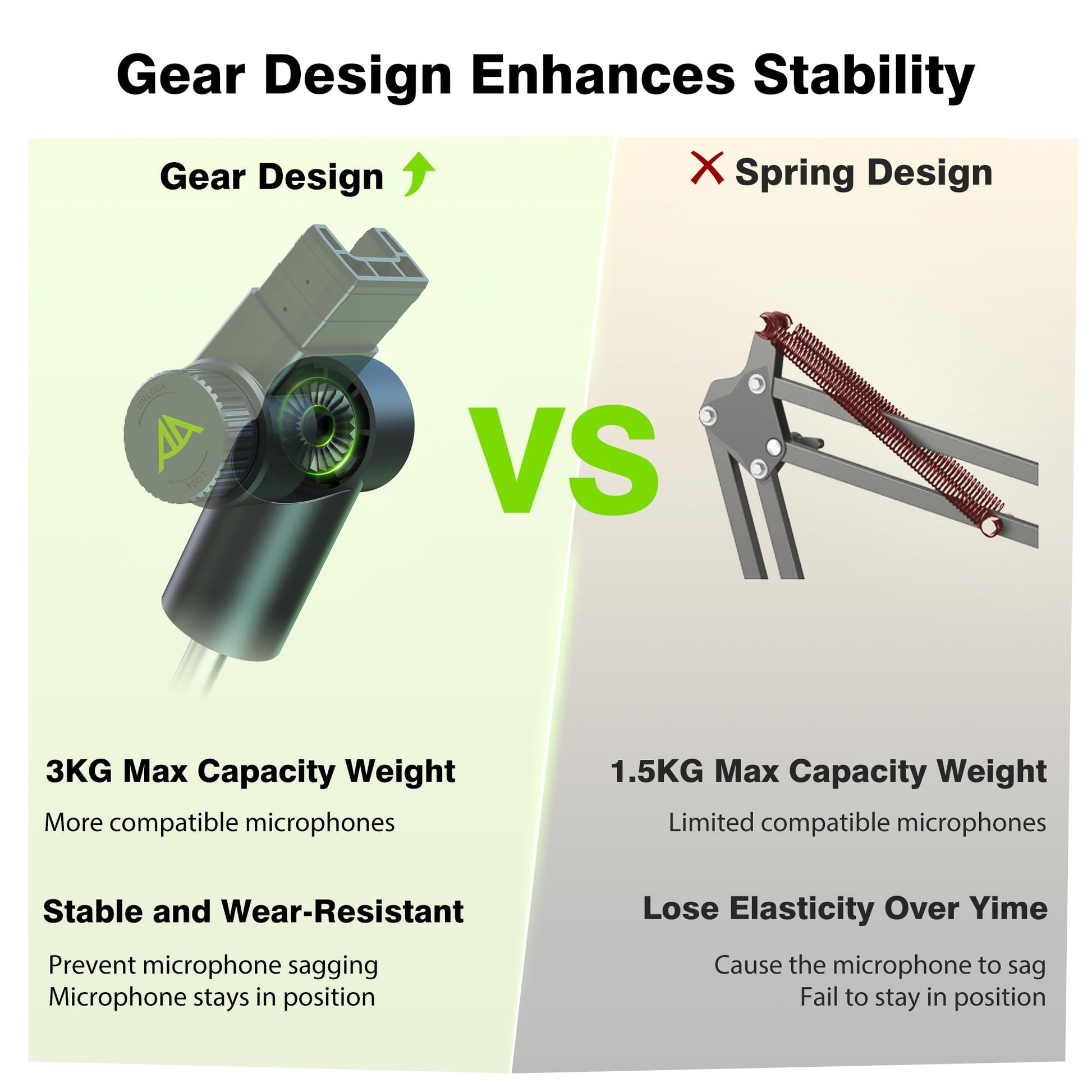 Der Gear-Lock ist ein spezieller Zahnrad-Mechanismus, der die gewählte Position des Arms bombenfest arretiert. Dies verhindert zuverlässig jedes Verrutschen oder Absacken, selbst bei schweren Mikrofonen und intensiver Nutzung.