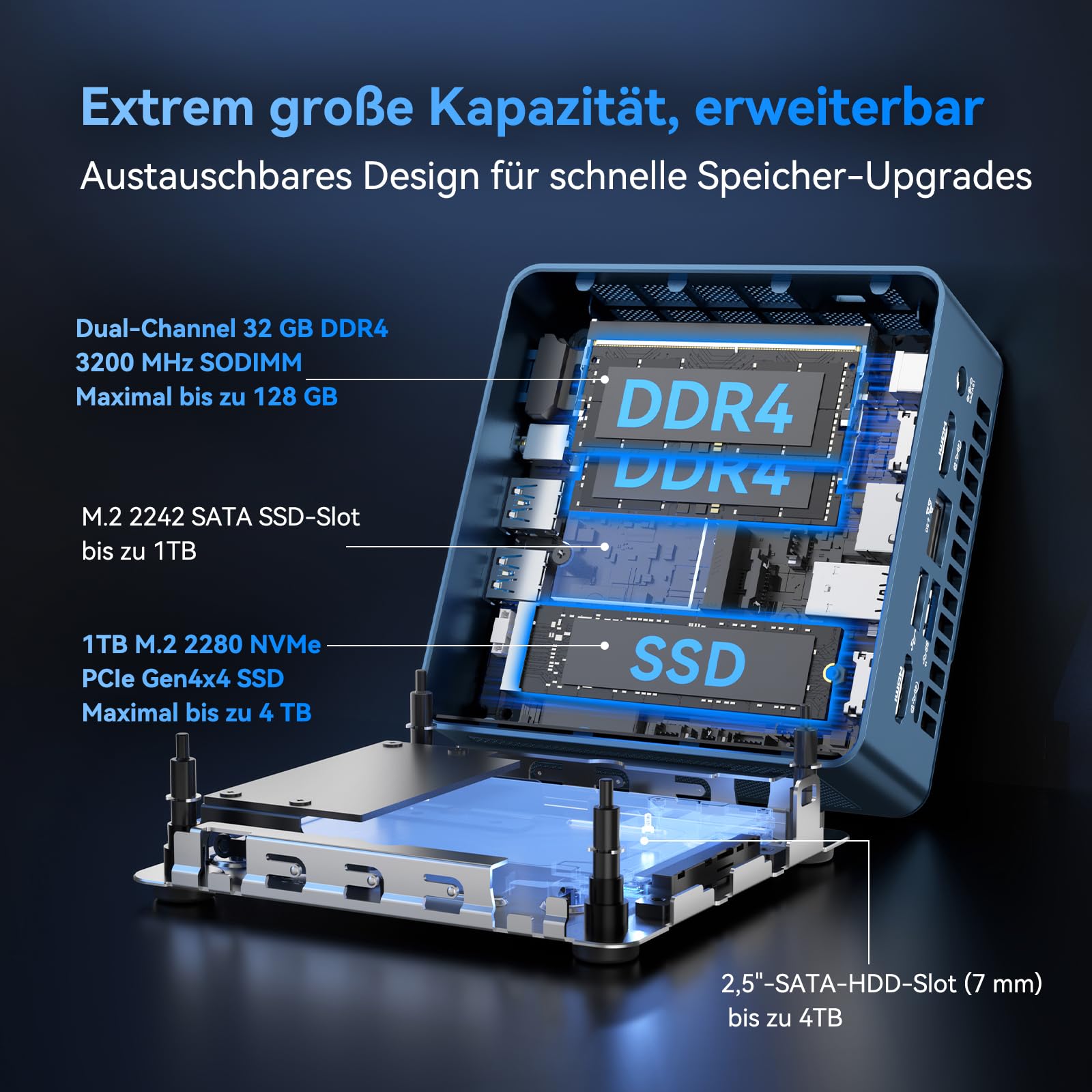 Ja, der Mini-PC ist sehr erweiterungsfreundlich. Der vorinstallierte 32 GB DDR4-Arbeitsspeicher kann auf massive 128 GB aufgerüstet werden. Neben der schnellen 1 TB PCIe Gen4 SSD gibt es zusätzliche Steckplätze für eine M.2 SATA SSD und eine 2,5-Zoll-SATA-Festplatte zur massiven Erweiterung der Speicherkapazität.