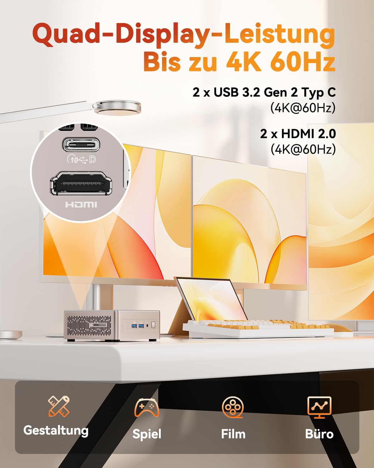 Brillante Darstellung auf bis zu vier Bildschirmen: Erweitern Sie Ihren Arbeitsbereich und steigern Sie Ihre Produktivität. Der Mini-PC unterstützt den Anschluss von bis zu vier 4K-Monitoren gleichzeitig. Über den Type-C-Anschluss ist sogar eine atemberaubende 8K-Auflösung möglich, ideal für professionelle Grafikarbeiten oder hochauflösendes Videostreaming.