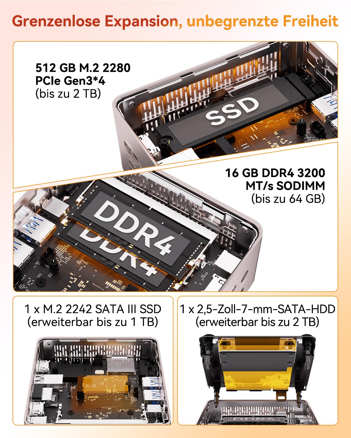 Ja, der Mini-PC ist sehr zukunftssicher. Sie können den Arbeitsspeicher von den vorinstallierten 16 GB auf bis zu 64 GB DDR4-RAM erweitern und zusätzlich zur 512 GB NVMe SSD eine weitere Festplatte für mehr Speicherplatz einbauen.