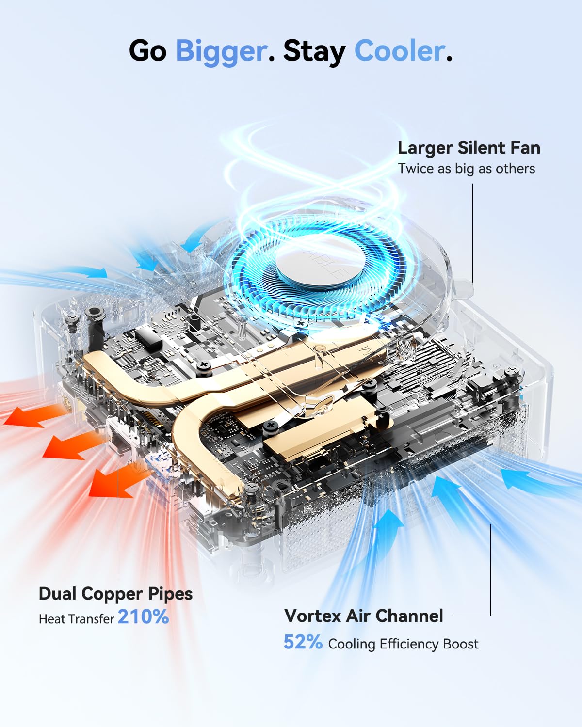 Dieser Mini-PC ist nicht nur kompakt, sondern auch für eine lange Lebensdauer gebaut. Die Kombination aus einem widerstandsfähigen Gehäuse und einem intelligenten Metall-Innenrahmen schützt die Hardware zuverlässig. Das innovative Kühlsystem garantiert dabei einen konstant leisen Betrieb, was die Lebensdauer der Komponenten verlängert und für eine angenehme Arbeitsatmosphäre sorgt.