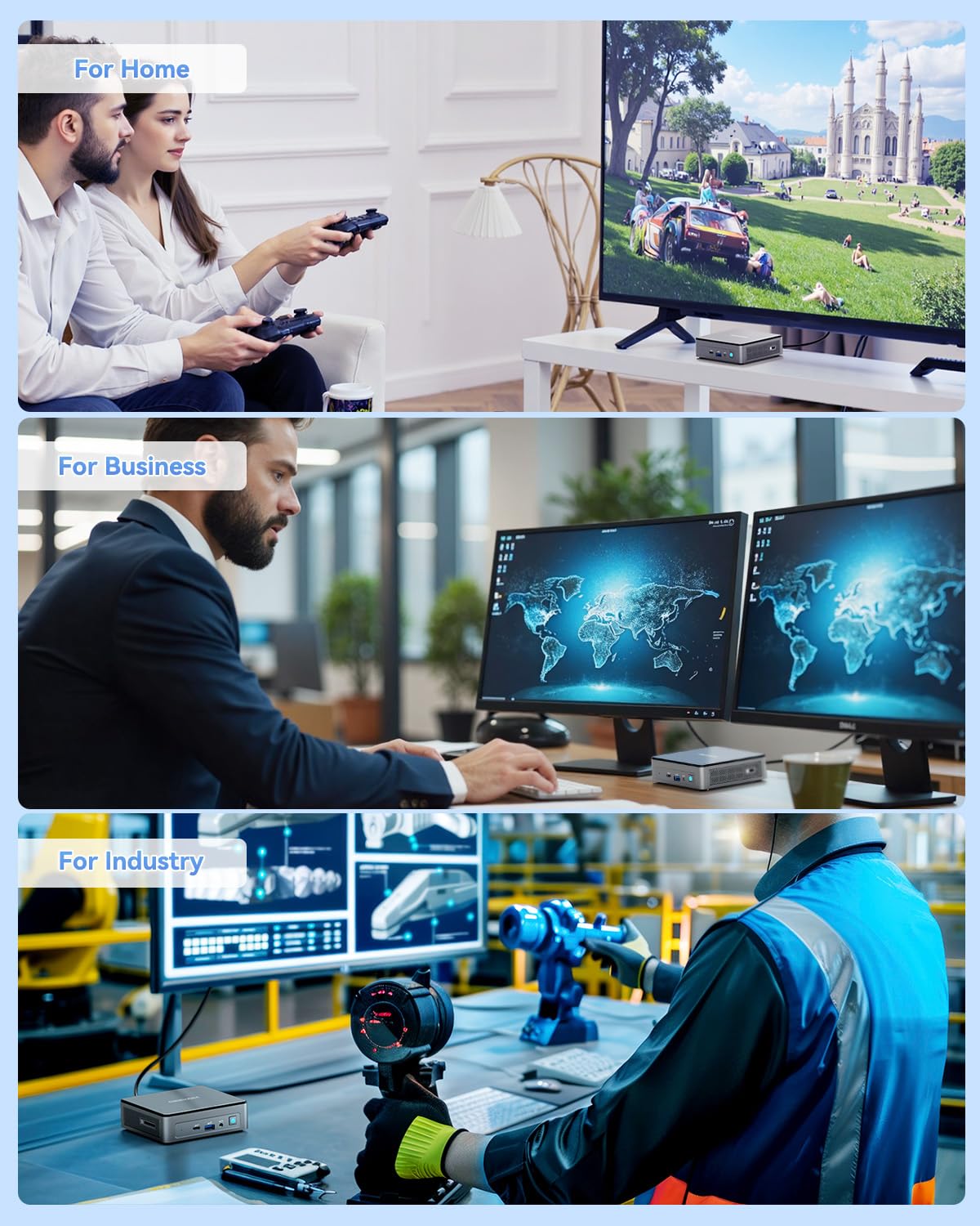 Der GEEKOM Air12 ist ideal für alltägliche Aufgaben im Büro, Home-Office und für die Schule. Er bewältigt problemlos Webbrowsing, Office-Anwendungen und Videokonferenzen. Dank seiner Fähigkeit, bis zu drei 4K/8K-Displays anzusteuern, ist er auch eine hervorragende und leise Wahl als Heimkino- und Streaming-Center.