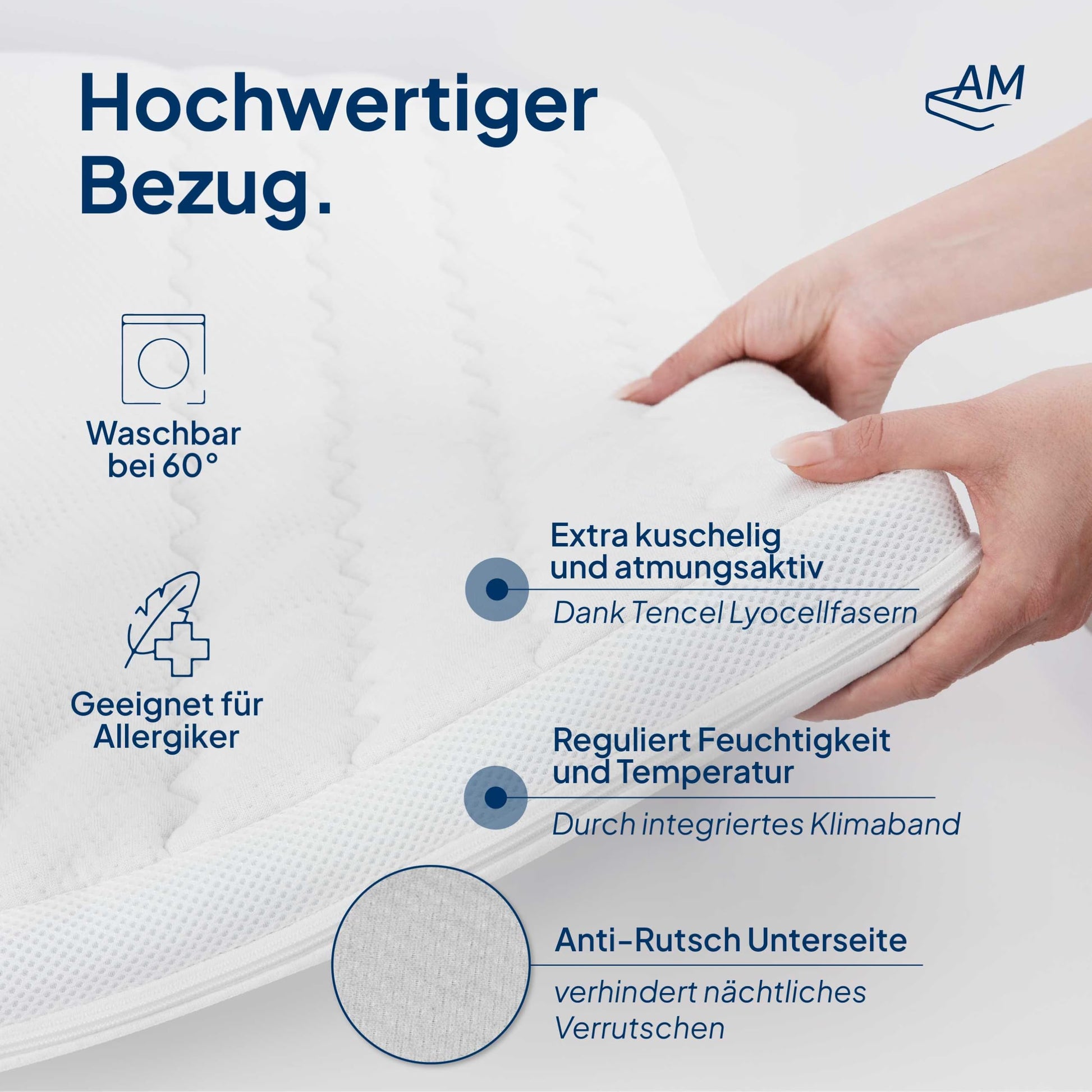 - Bezug: Hochwertiger TENCEL™ Lyocell-Bezug (40% Lyocell, 60% Polyester) mit versteppter Klimafaser (400 g/m²).