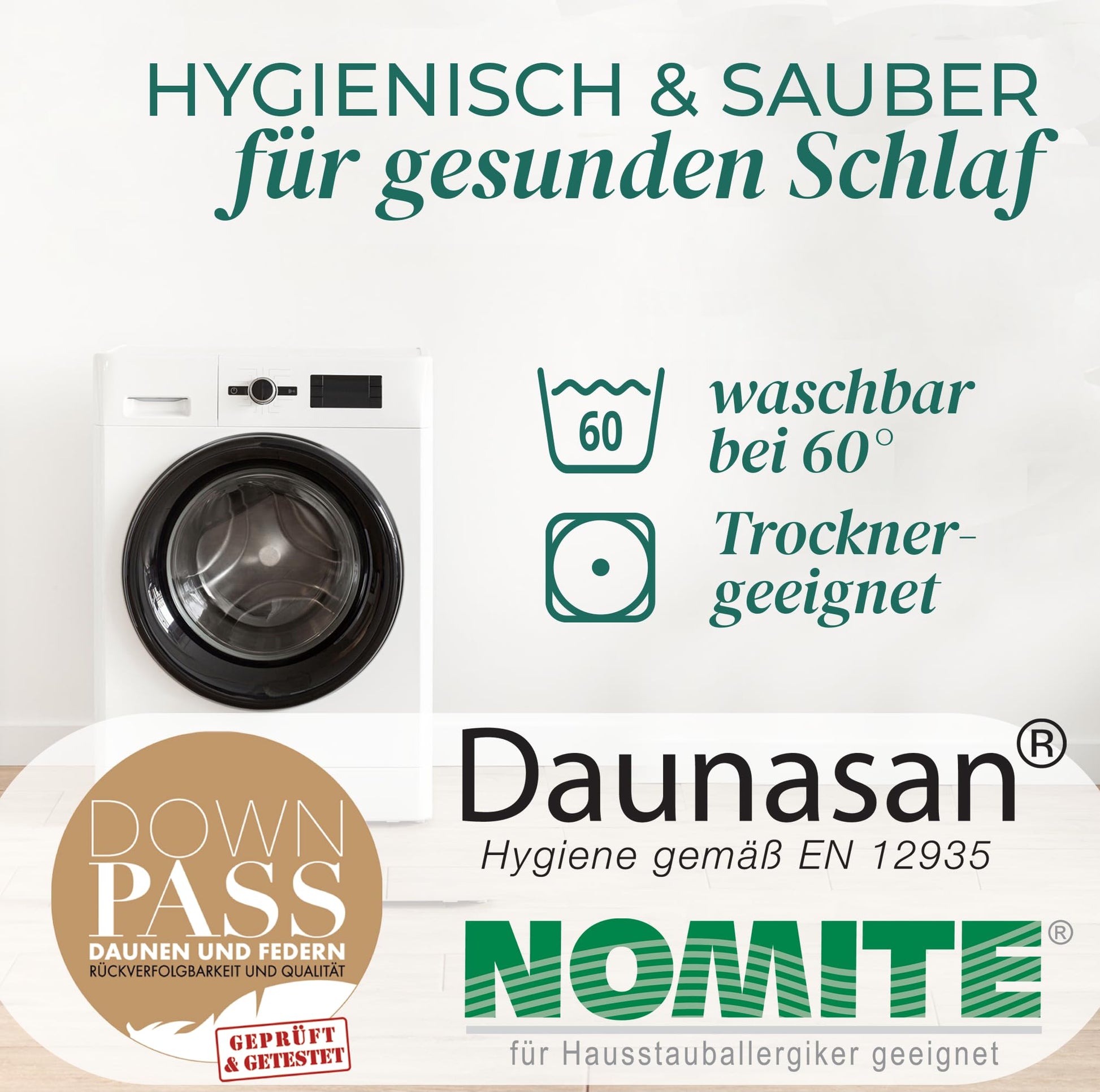 - Zertifizierte Füllung: Ausgezeichnet mit den Siegeln Nomite und Daunasan, gefüllt mit Daunen und Federn aus verantwortungsvoller Herkunft.