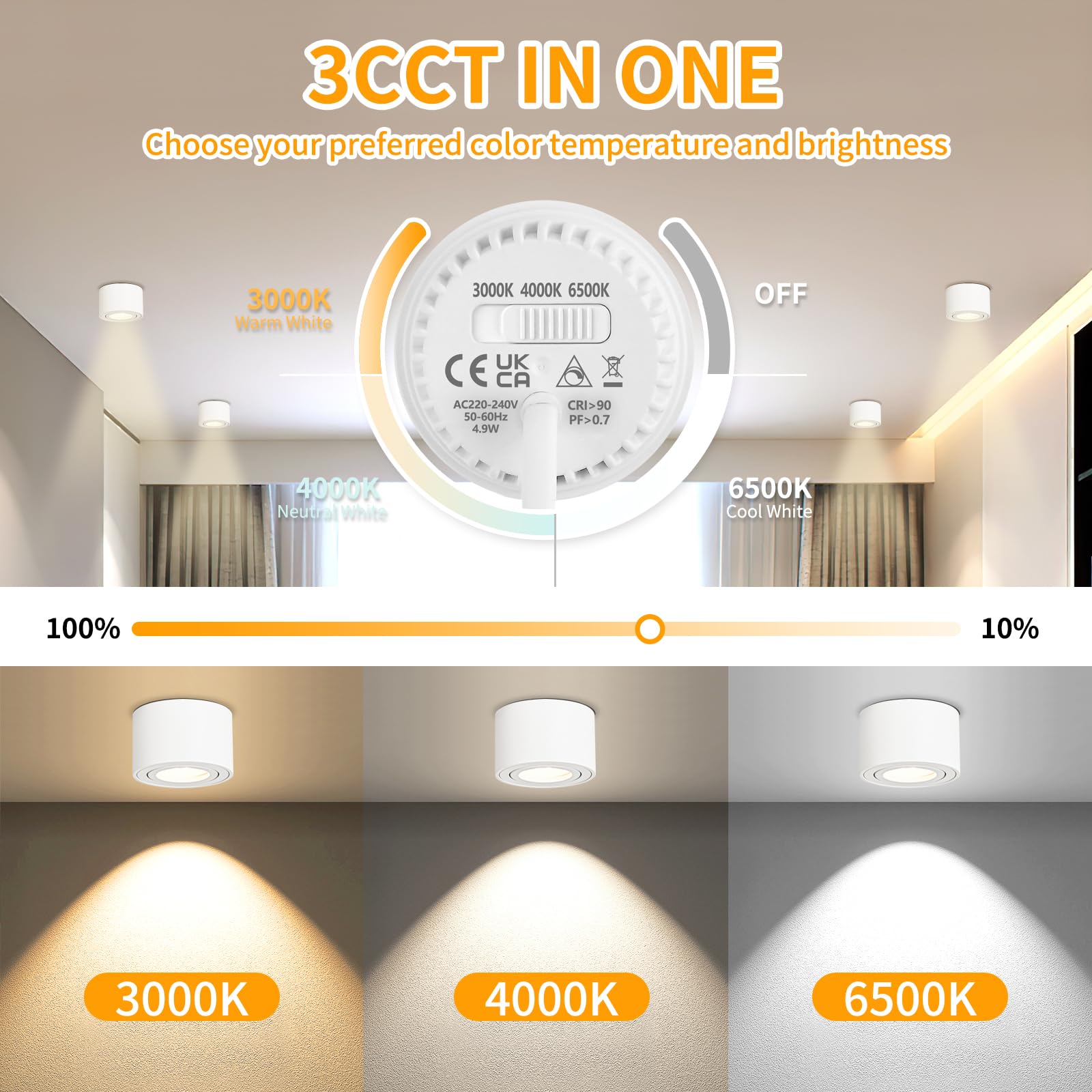 - Lieferumfang: 4x weisse Aufbauspots, 4x 5W 3CCT LED-Module, Anschlussklemmen, 8x Dehnschrauben und Schrauben, Montageanleitung.