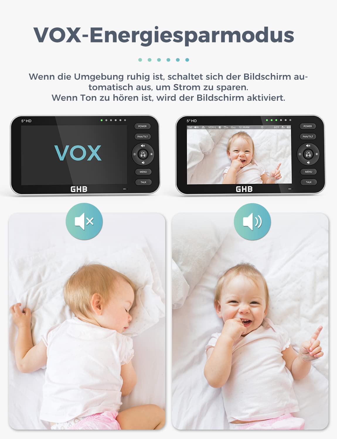 - Geräuscherkennung: Das Babyphone reagiert im VOX-Modus auf Geräusche. Eine Funktion zur Bewegungserkennung ist nicht vorhanden.