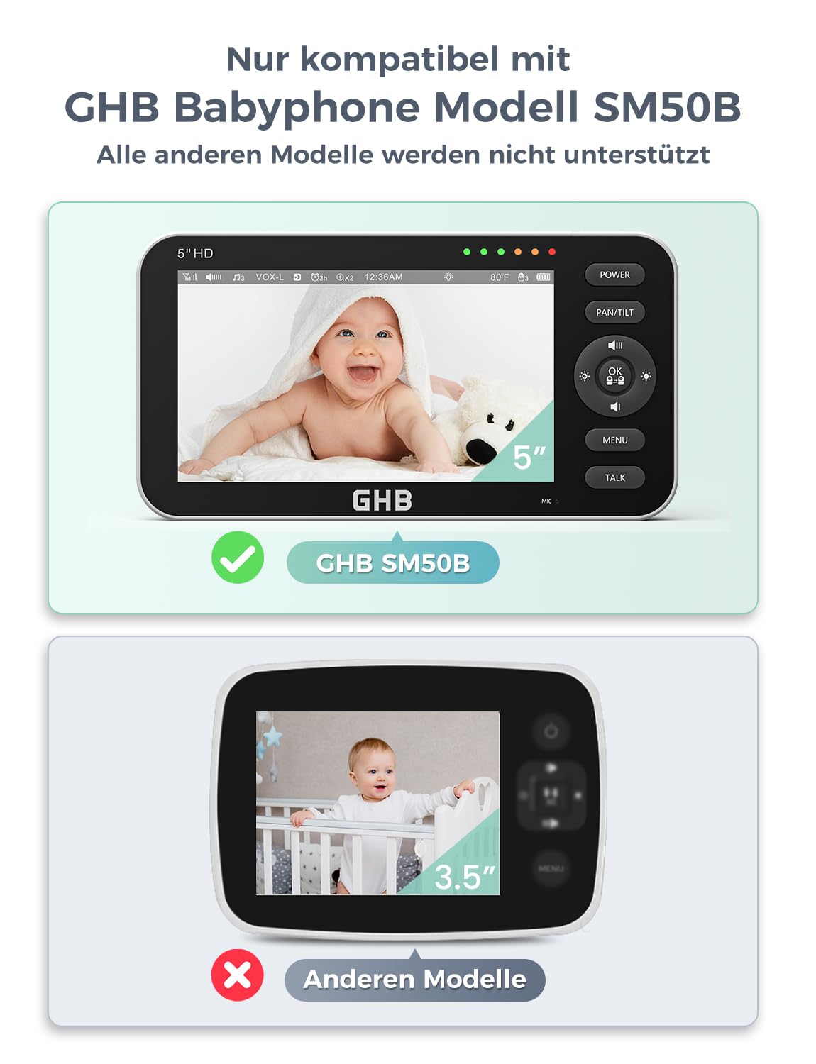 Diese Kamera ist ausschliesslich mit dem GHB 5-Zoll-Babyphone des Modelljahres 2023 (Modell SM50B) kompatibel. Sie funktioniert nicht mit älteren Versionen oder anderen Babyphone-Marken. Bitte prüfen Sie vor dem Kauf die Modellbezeichnung auf Ihrer Elterneinheit.